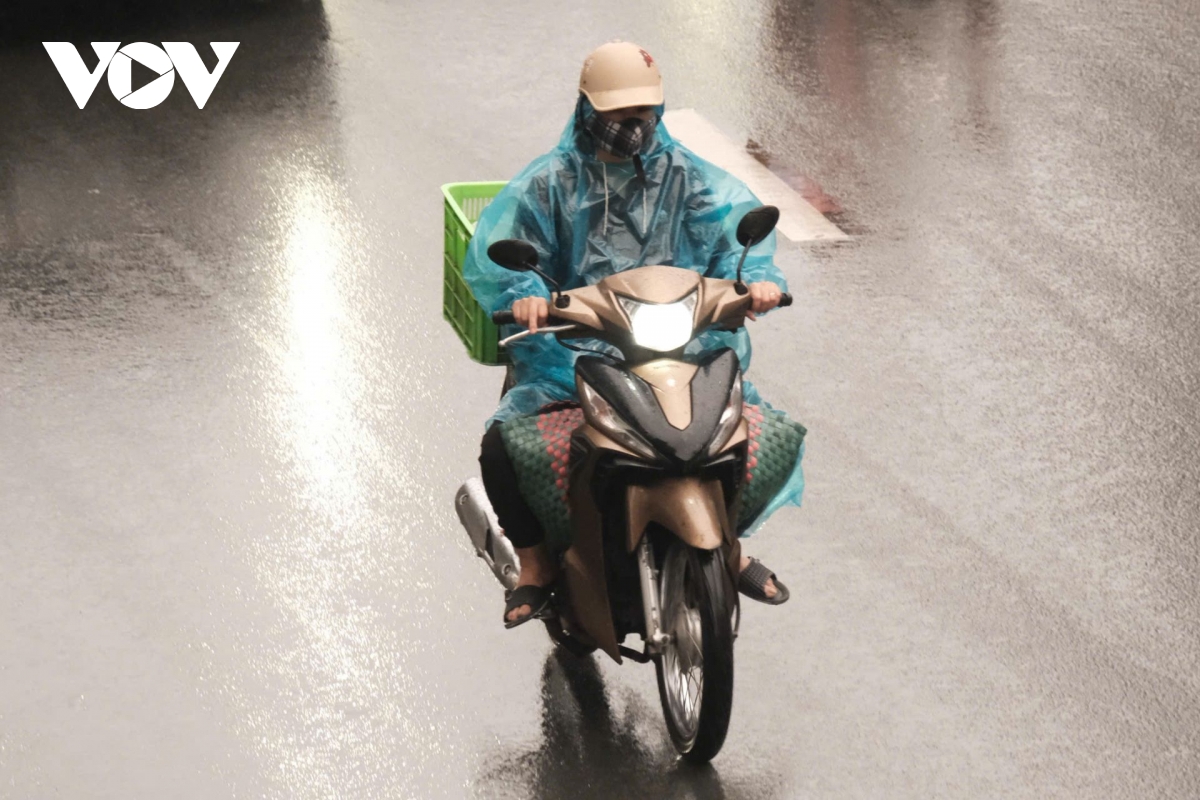 Đầu giờ sáng, trời có mưa phùn nhẹ kèm theo lớp sương mù khiến nhiều người tham gia giao thông cảm thấy khó chịu. Không ít người phải mặc áo mưa mỏng và bật đèn pha để đảm bảo quan sát, tránh nguy hiểm trên đường.
