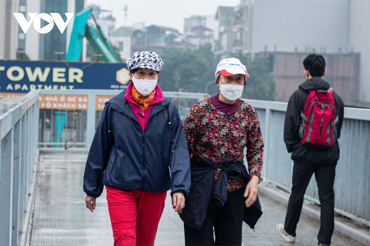Ngày nào cũng đi tập thể dục quanh khu vực đường Nguyễn Trãi, bà Hồng (bên trái) cho biết hai hôm nay thời tiết hanh khô, bụi nhiều gây khó chịu. Nghe báo đài liên tục cảnh báo ô nhiễm, bà đã hạn chế ra ngoài. “Hôm nay nghỉ vài hôm rồi chán quá nên tôi vẫn phải đi tập, nhưng ra đường là bịt rất kín để tránh ảnh hưởng sức khỏe”, bà chia sẻ.
