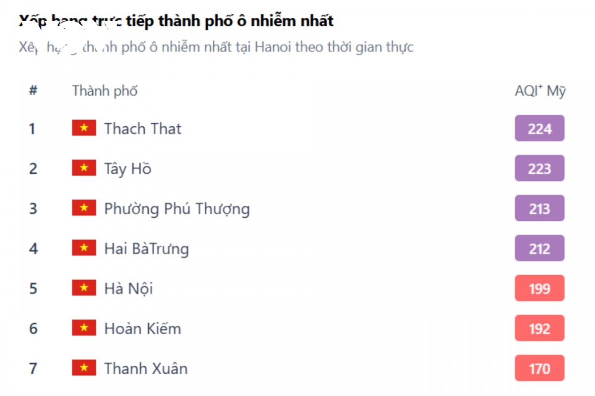 Đợt ô nhiễm không khí tại Hà Nội đã kéo nhiều ngày qua và có xu hướng ngày càng nghiêm trọng. Sáng 1/12, nhiều khu vực Thủ đô tiếp tục chìm trong lớp bụi mịn dày đặc. Dữ liệu từ nền tảng theo dõi chất lượng không khí toàn cầu IQAir cho thấy phần lớn điểm đo ở Hà Nội đều ở ngưỡng rất xấu, với chỉ số AQI⁺ dao động 200–300, mức được cảnh báo rất có hại cho sức khỏe của toàn bộ người dân.