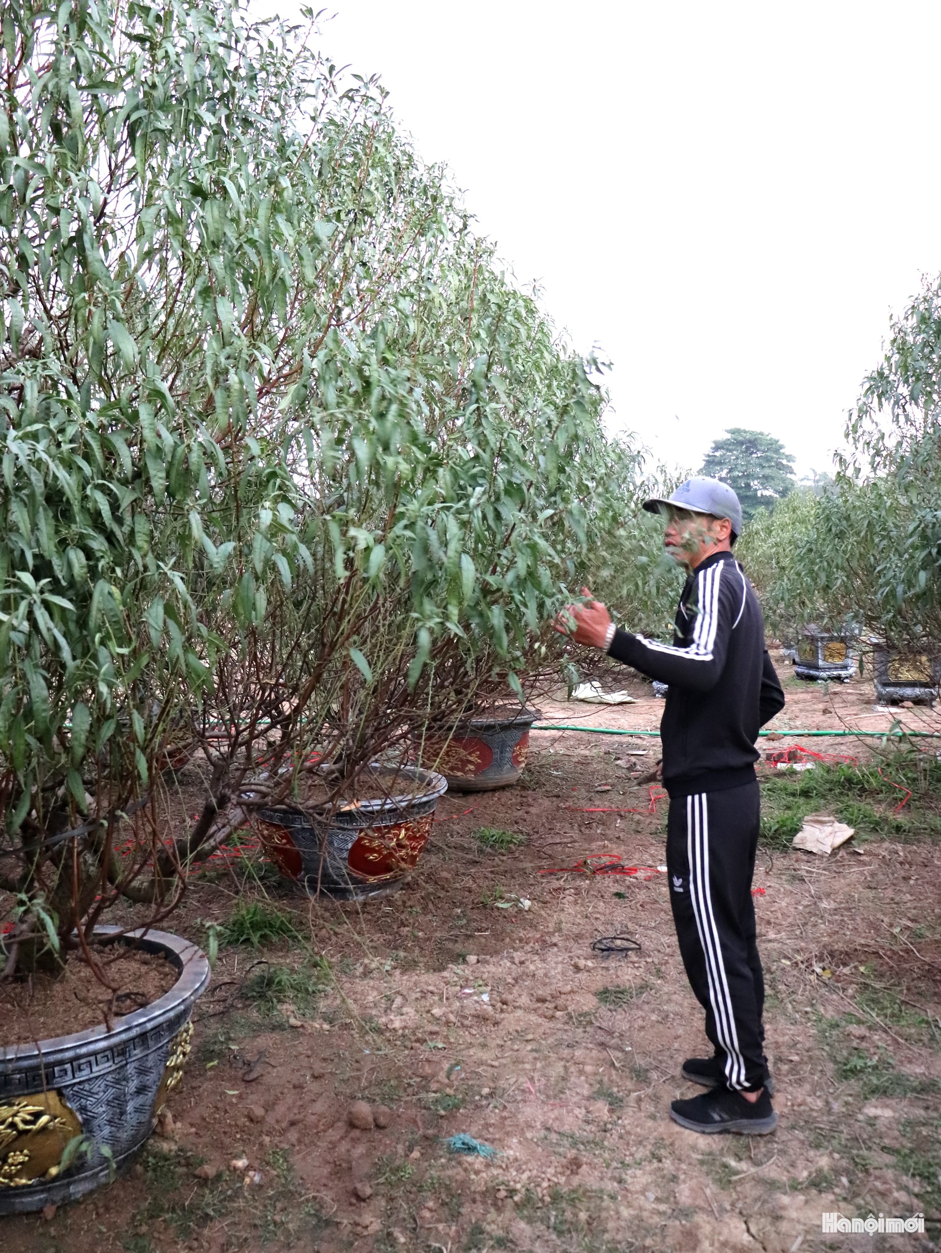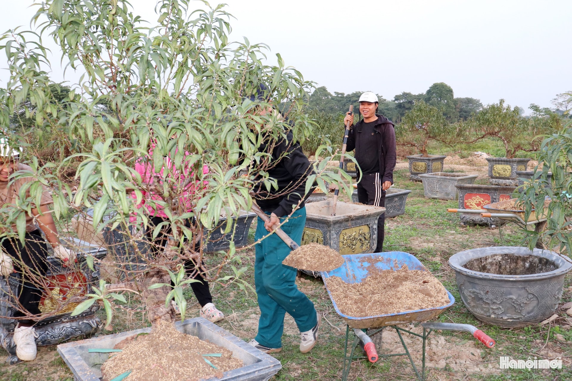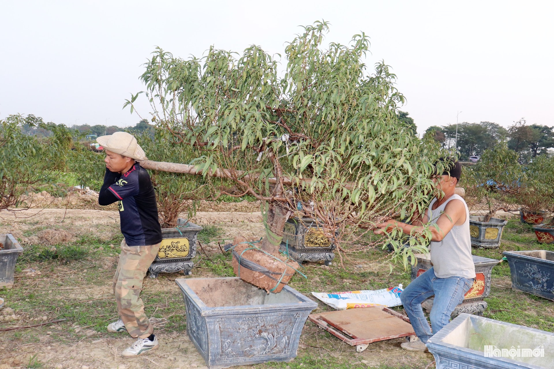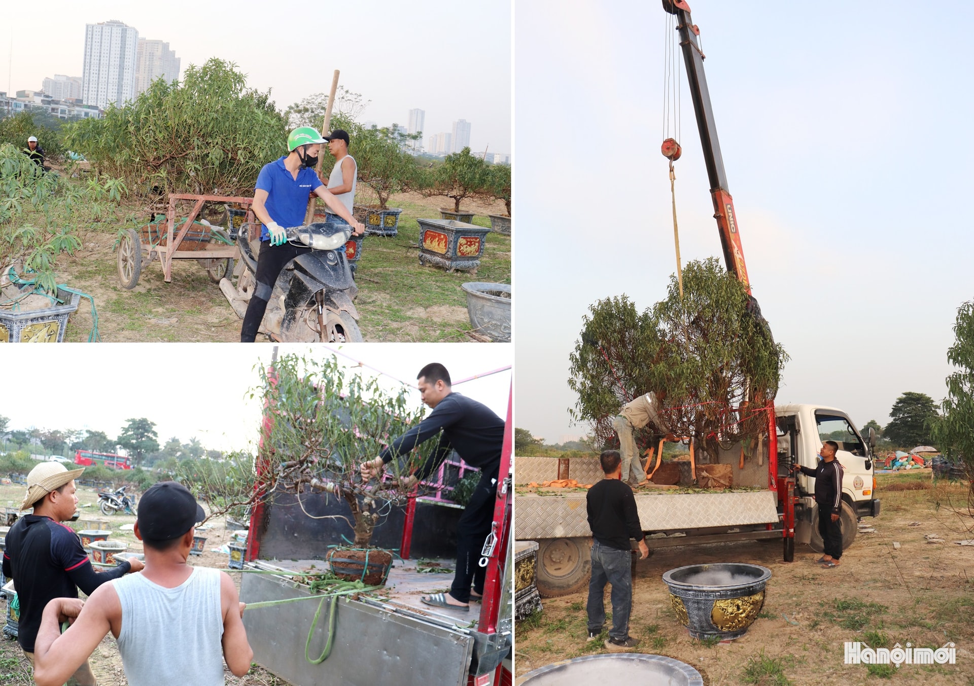 Đào được các nhà vườn ở La Cả (phường Dương Nội) vận chuyển bằng xe máy và xe tải đến vườn ở phường Kiến Hưng chăm sóc. Ảnh: TĐ