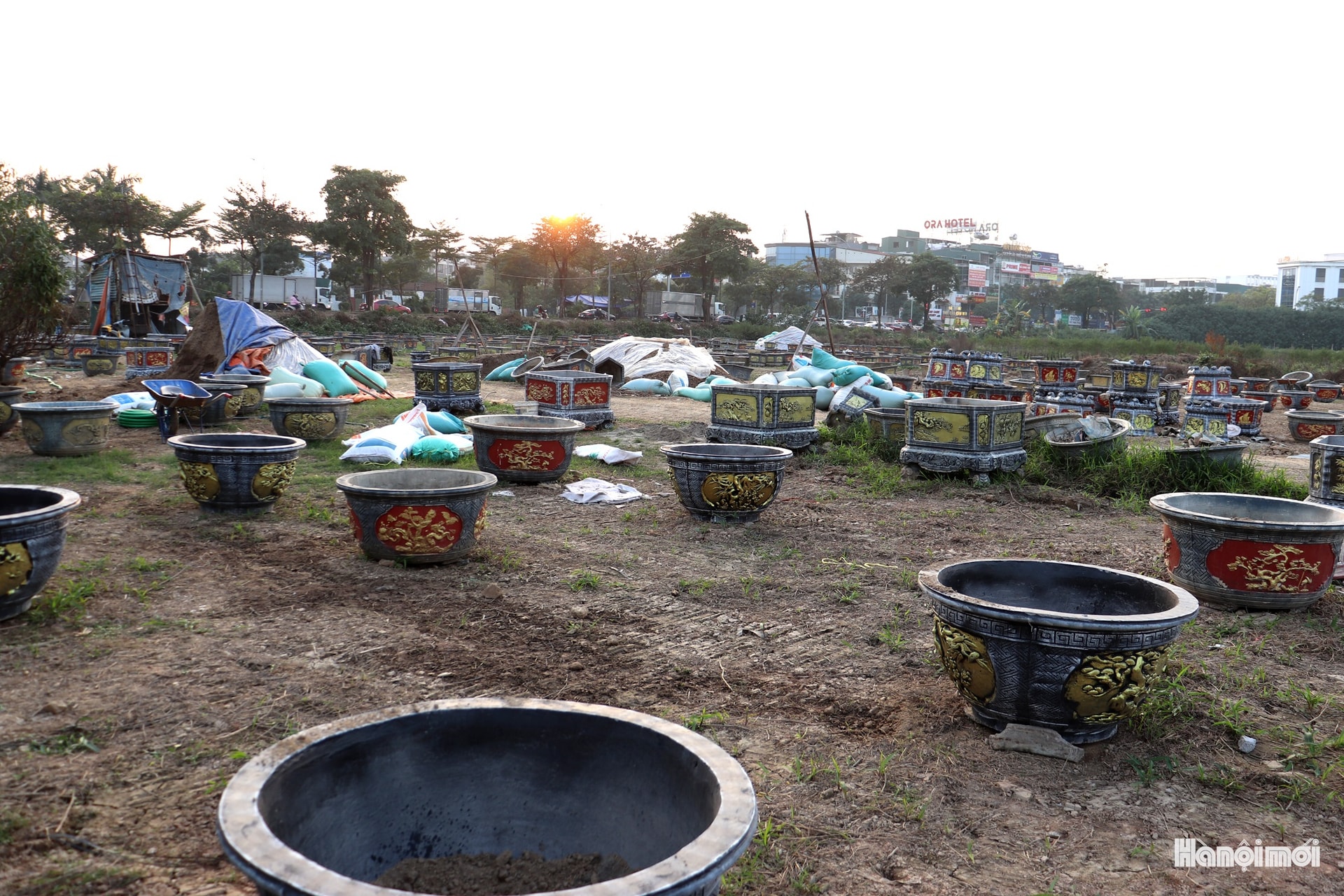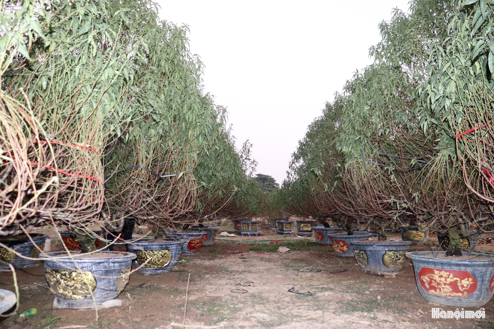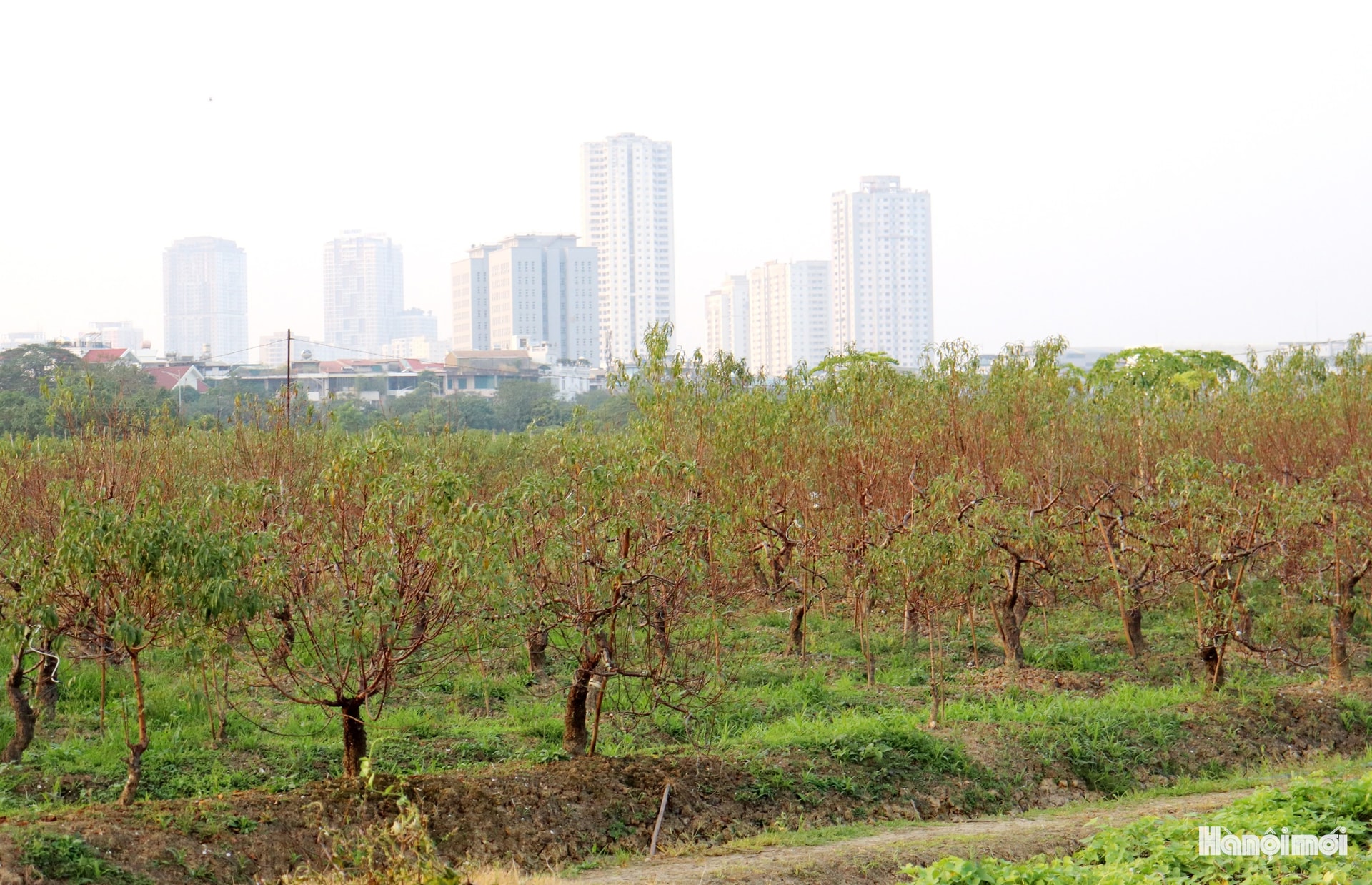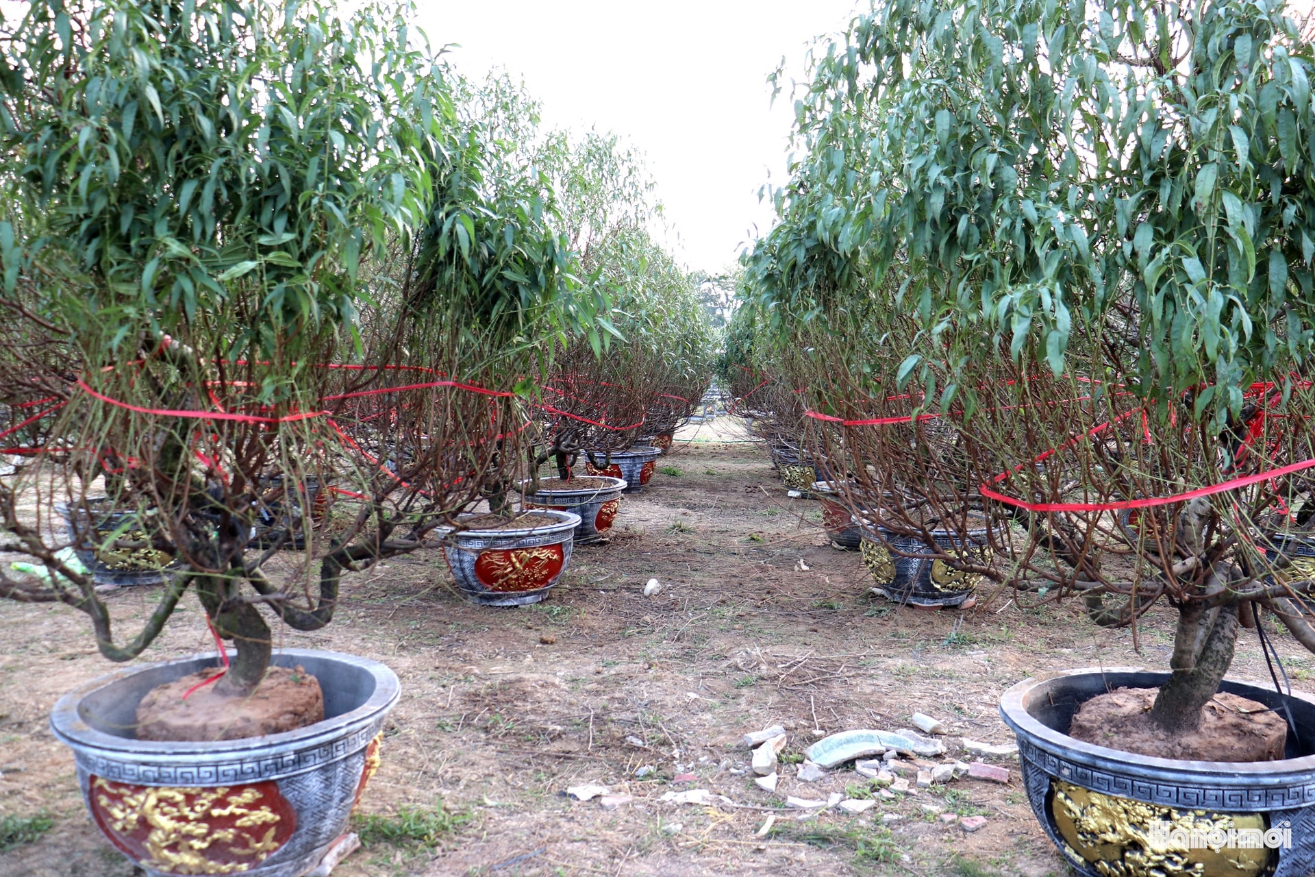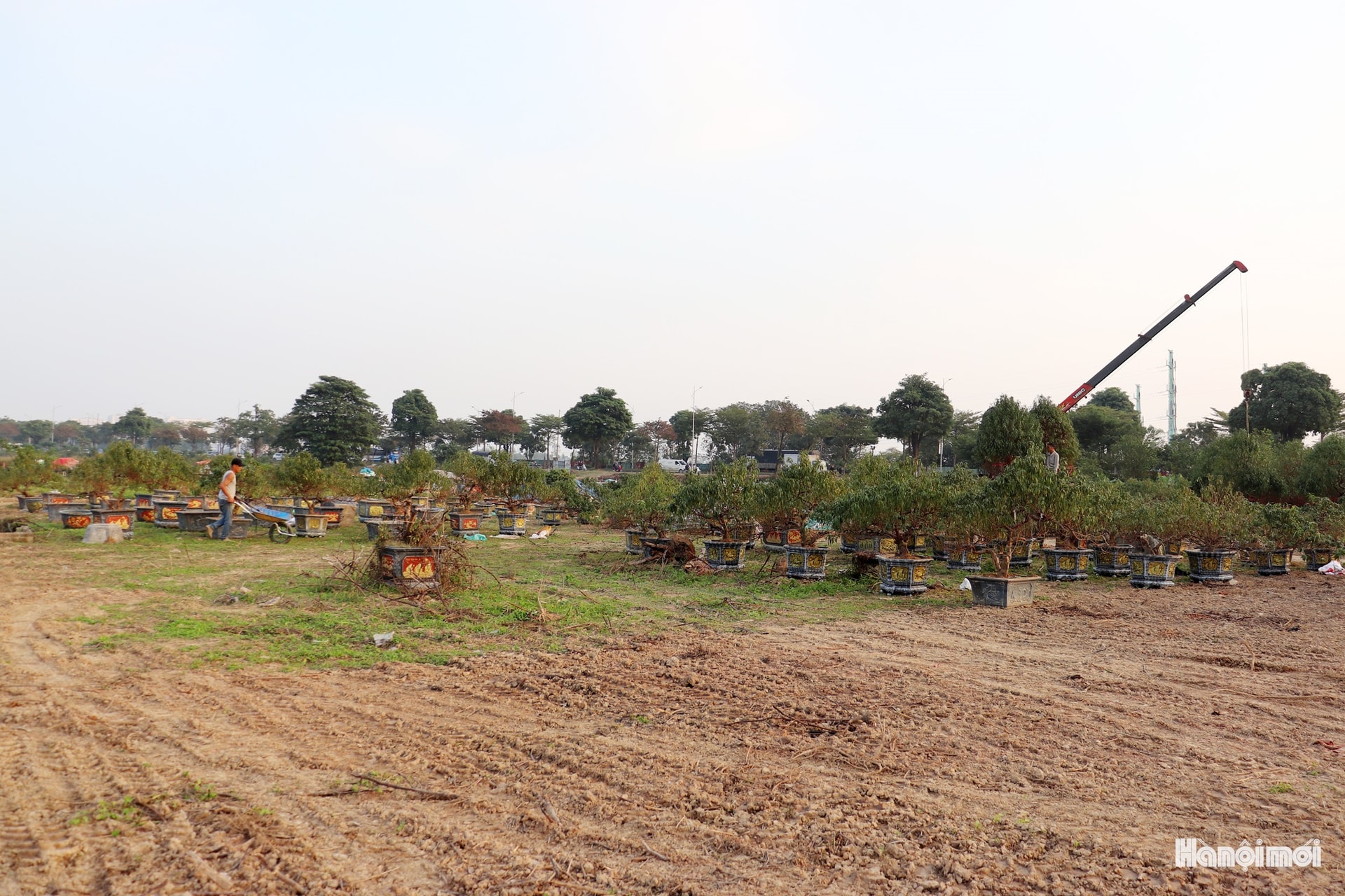 Đào được các nhà vườn ở La Cả (phường Dương Nội) vận chuyển bằng xe máy và xe tải đến vườn ở phường Kiến Hưng chăm sóc. Ảnh: TĐ