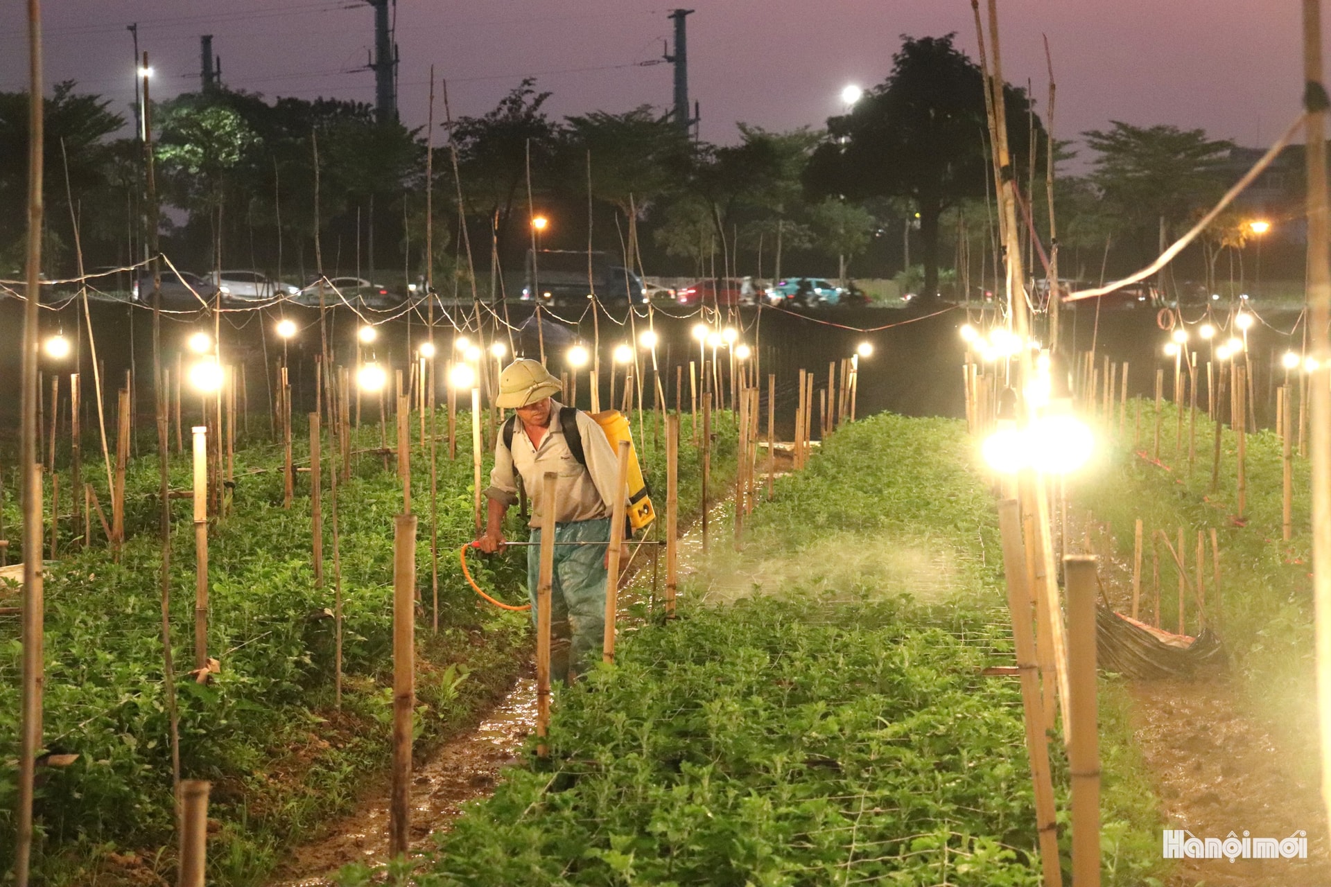 Ông Thiện trồng khoảng 5 sào hoa cúc. Để hoa nở bông đẹp đúng dịp Tết, ông phải thắp đèn ban đêm cho hoa, ngăn cây phân hóa mầm hoa sớm, giúp cây tiếp tục sinh trưởng thân, lá. Nhờ đó, nhà vườn có thể chủ động điều chỉnh cho hoa nở đúng dịp Tết, bông to, cành dài và chất lượng đồng đều. Ảnh: TĐ