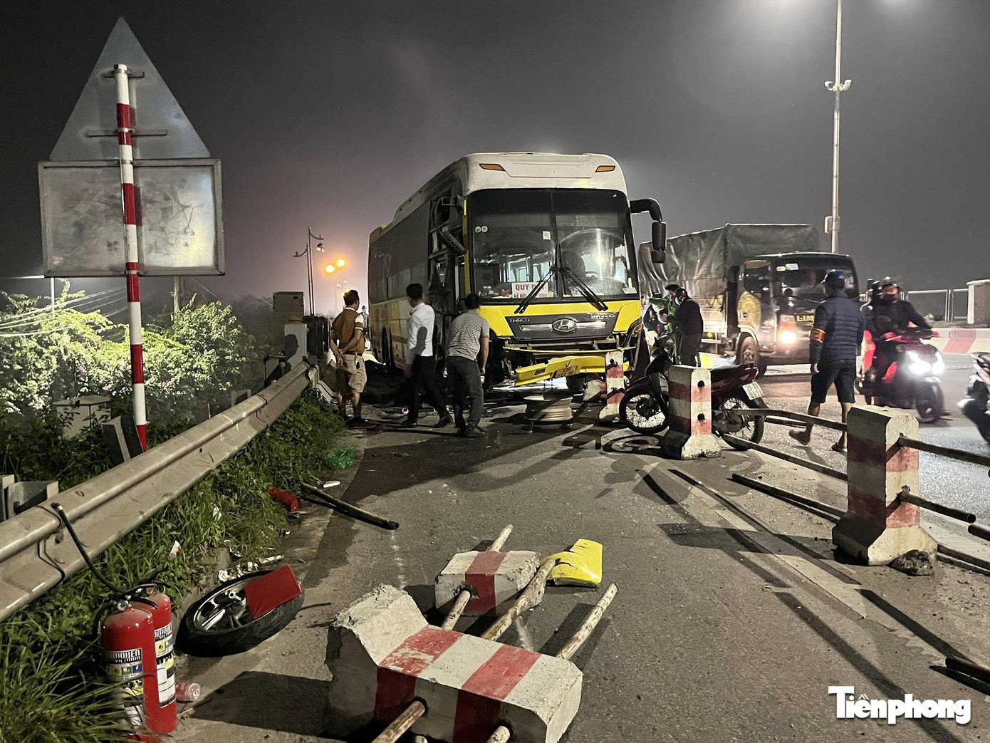 Vào thời điểm trên, xe khách chưa rõ BKS di chuyển hướng cầu Thanh Trì đi đường Đỗ Mười va chạm với dải phân cách trên đường và 1 xe máy.