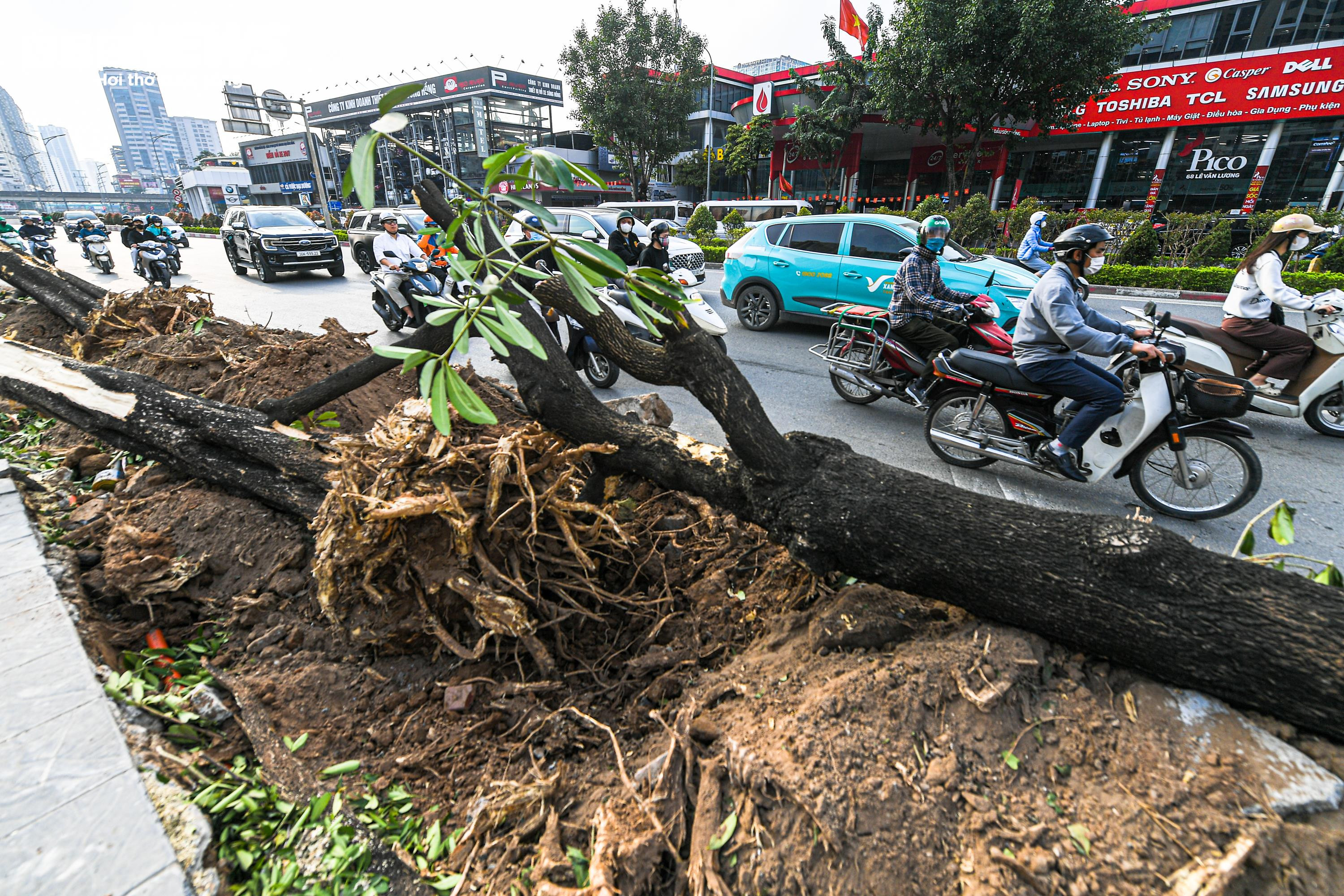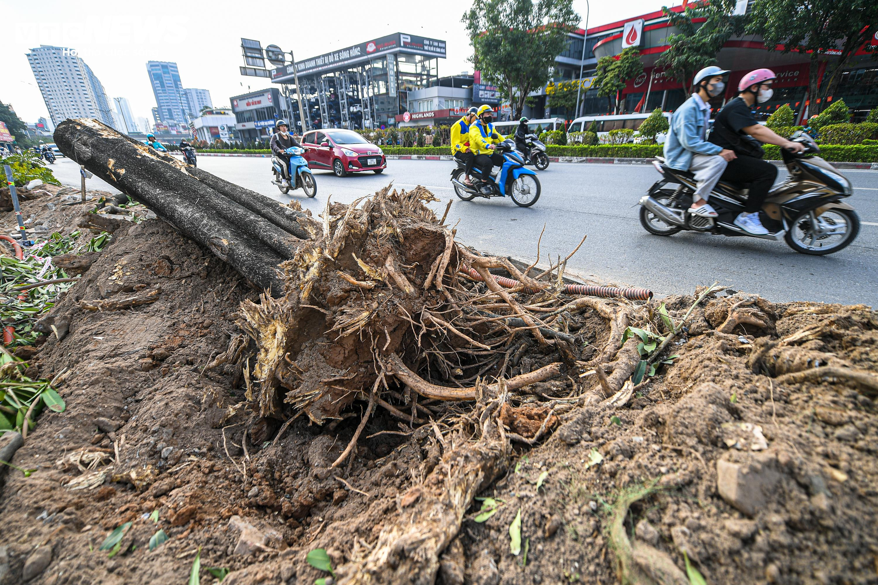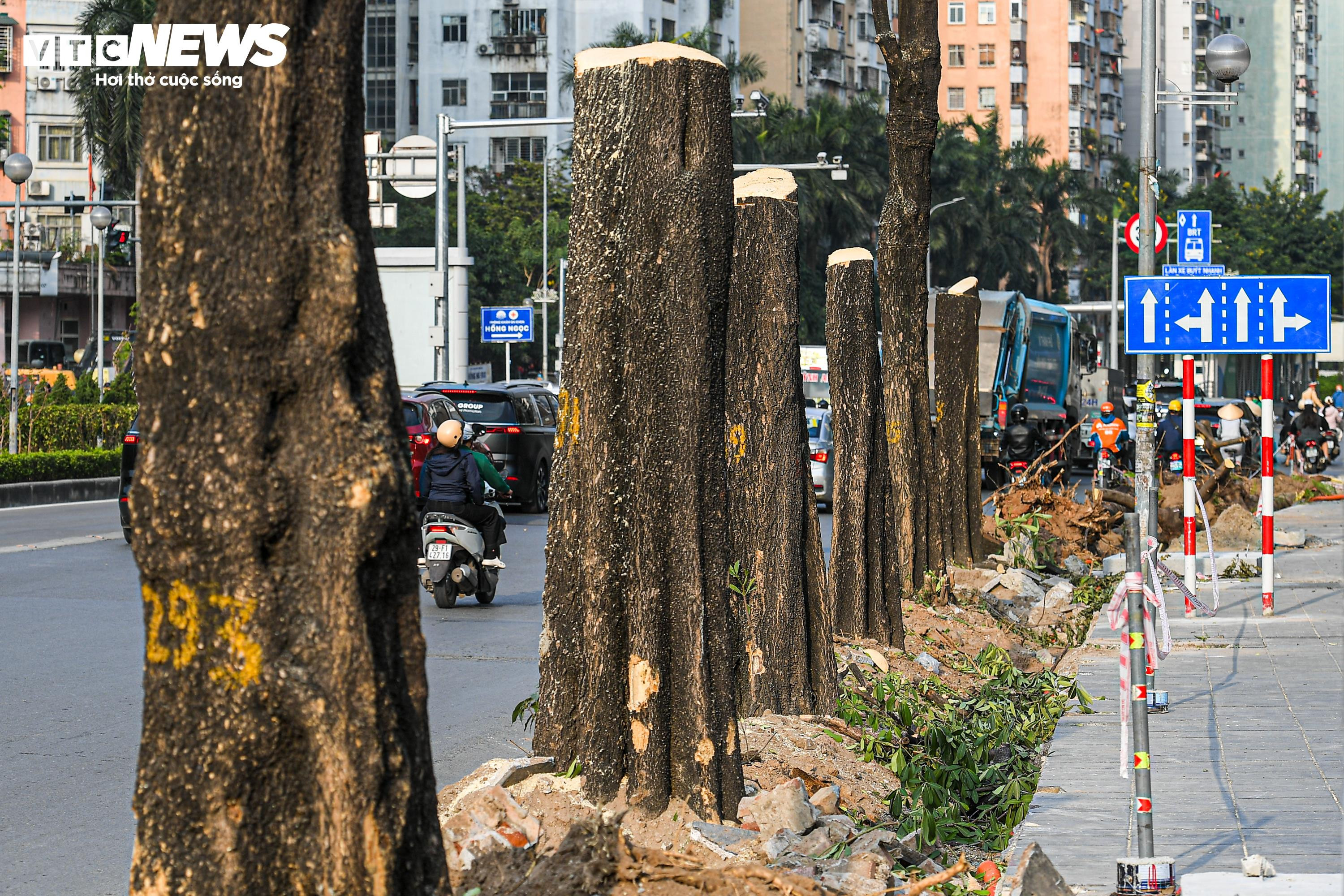 Một số cây xanh nằm sát mép vỉa hè được chặt hạ, trong khi khoảnh 40 cây khác được cắt tỉa cành, giữ nguyên bầu đất, chuẩn bị đánh chuyển sang vị trí mới.