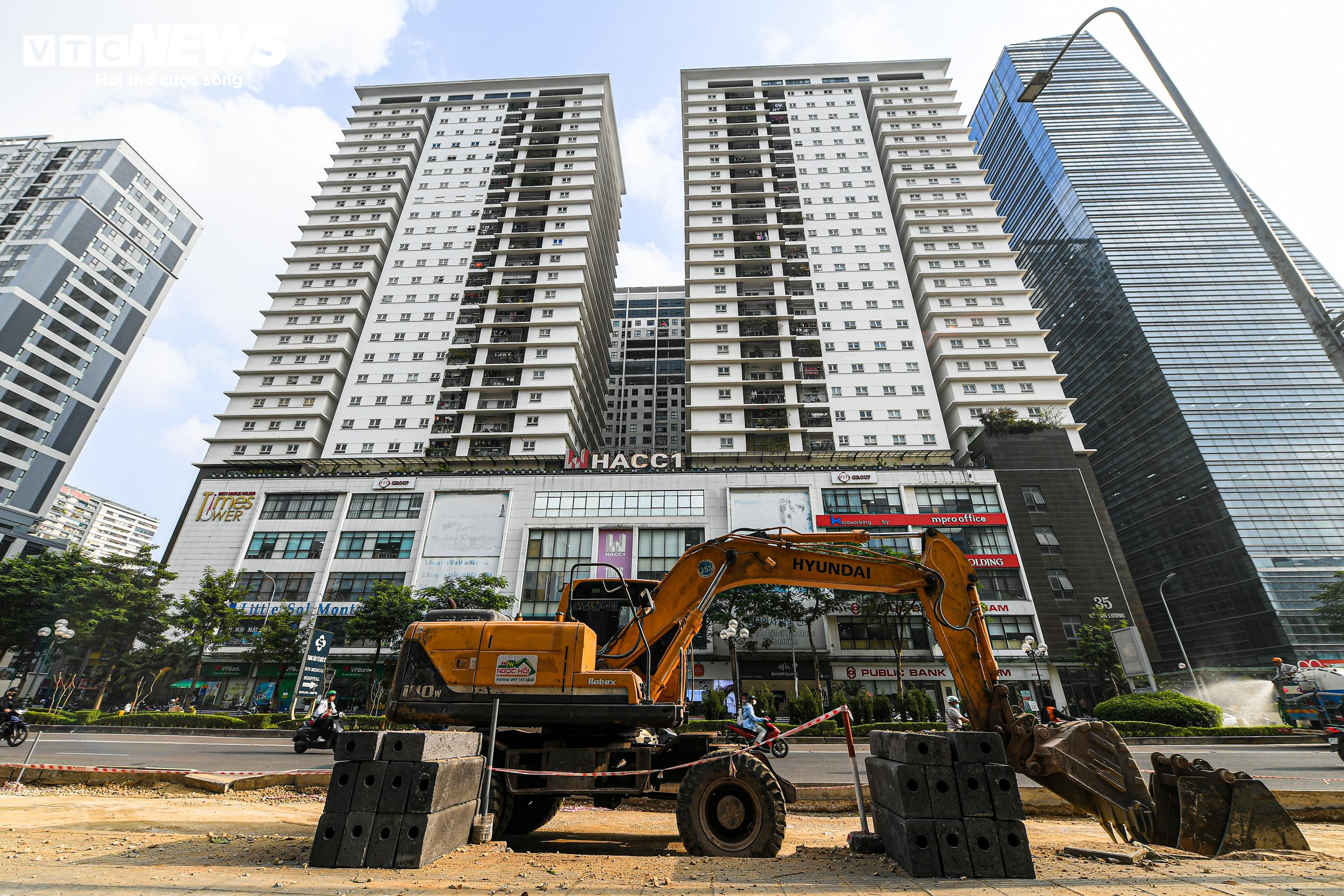 Ghi nhận của PV Báo Điện tử VTC News chiều 22/12, tại khu vực nút giao Lê Văn Lương - Hoàng Minh Giám - Nguyễn Tuân, hoạt động thi công diễn ra khẩn trương. Các đoạn vỉa hè cũ được xén gọn gần 2m, máy móc hoạt động liên tục để mở rộng lòng đường.
