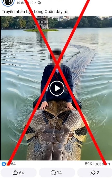 Vào ngày 25/12/2025, qua công tác nắm tình hình trên không gian mạng, Phòng An ninh mạng và phòng, chống tội phạm sử dụng công nghệ cao CATP Hà Nội phát hiện một tài khoản Facebook đăng tải video có tiêu đề “Truyền nhân Lạc Long Quân đây rùi”. Nội dung video hiển thị hình ảnh một người ngồi trên một con trăn khổng lồ đang bơi trên mặt hồ Hoàn Kiếm.