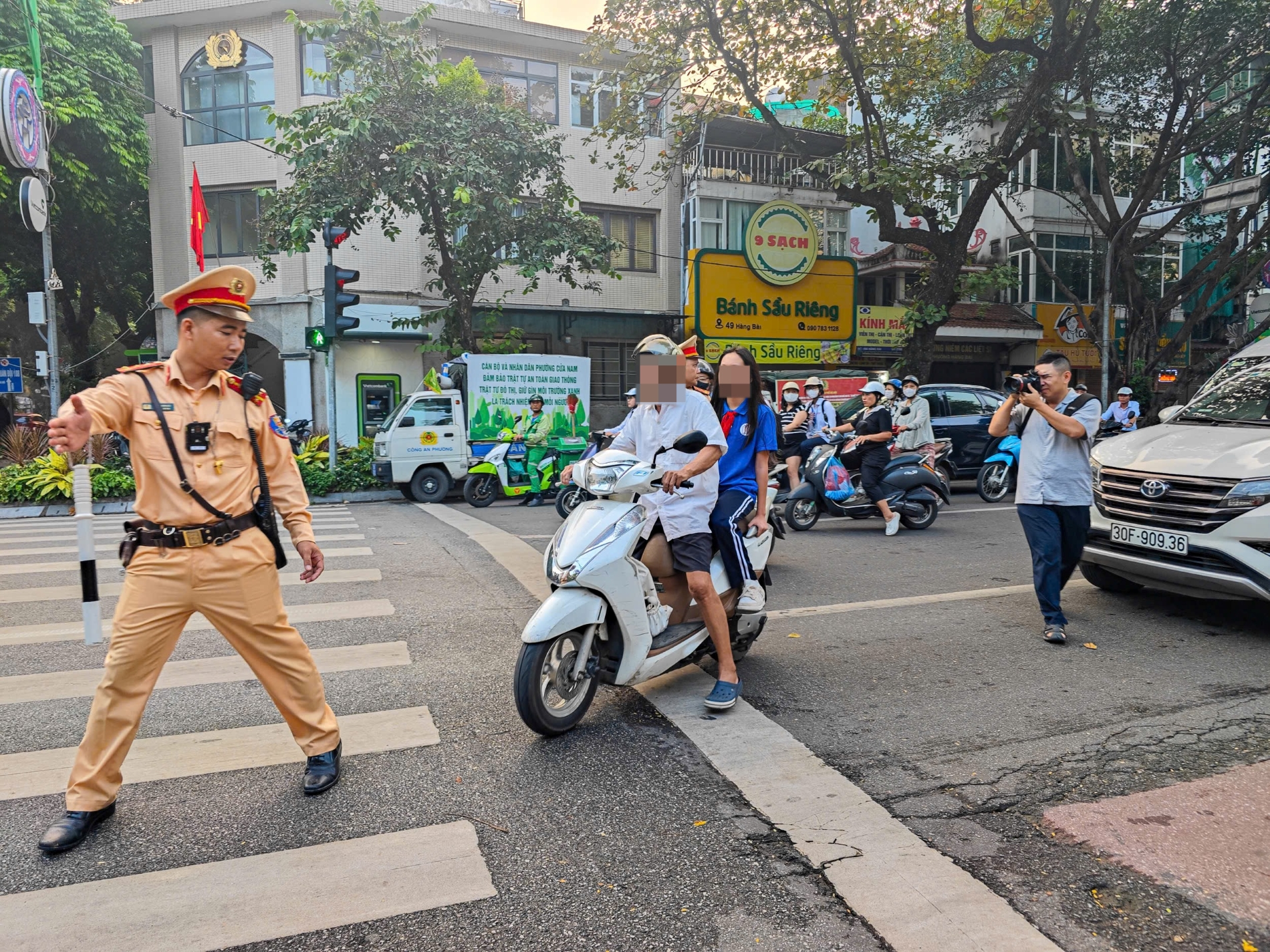 Cảnh sát giao thông Hà Nội xử lý học sinh điều khiển xe không đội mũ bảo hiểm khi tham gia giao thông.
