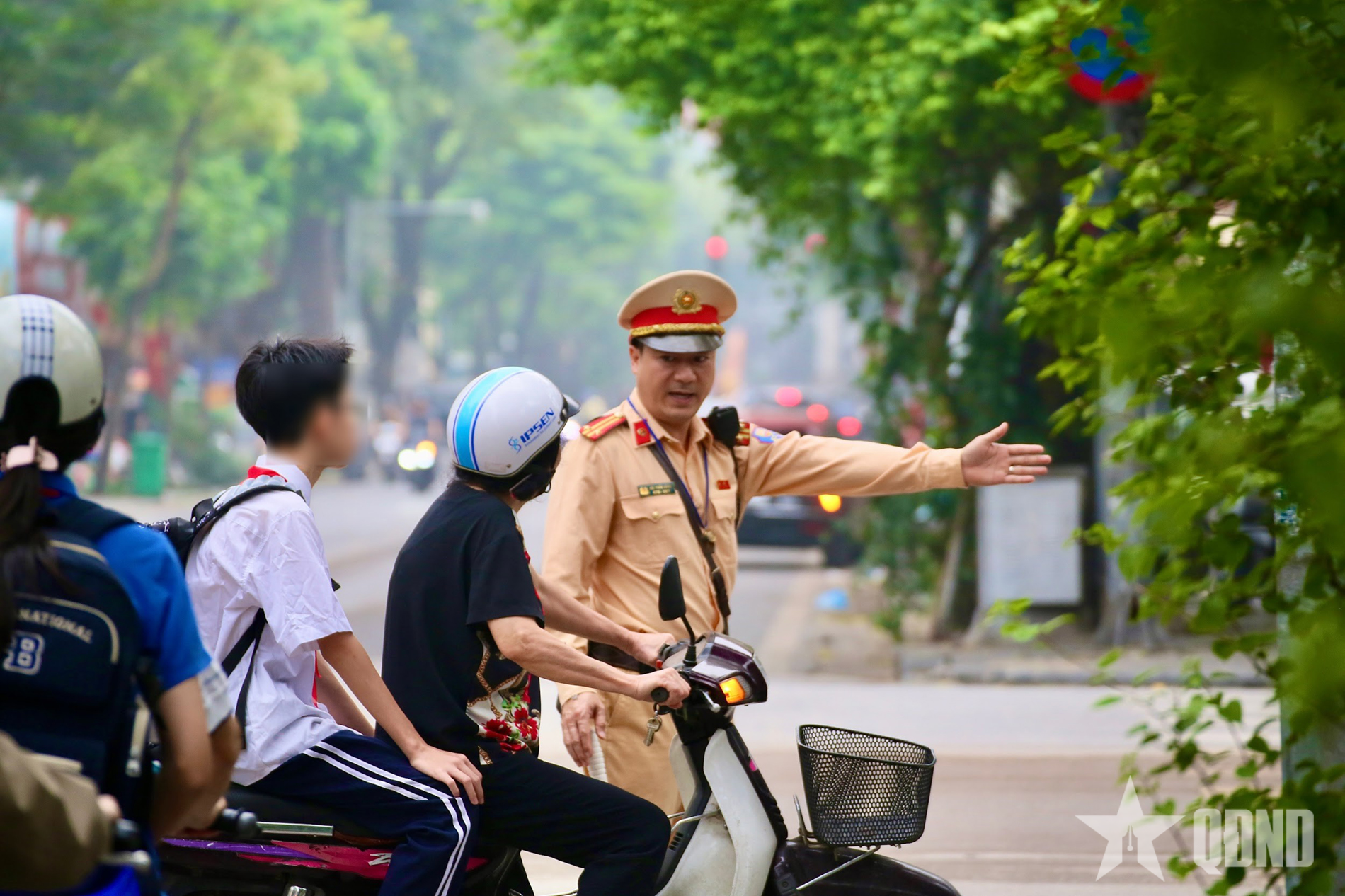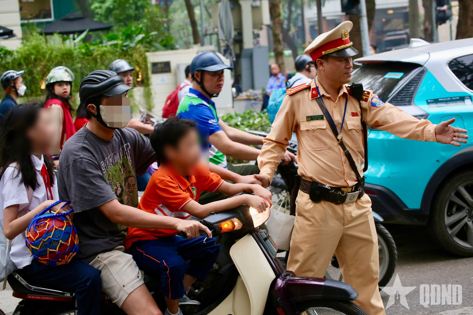 Cảnh sát kiểm tra trường hợp phụ huynh chở học sinh không đội mũ bảo hiểm, sáng 6-4.