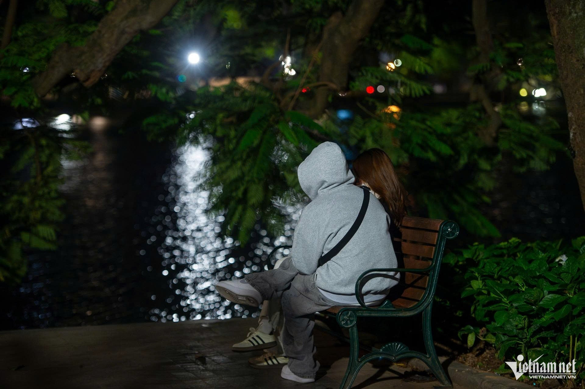 Lúc 23h, một cặp đôi vẫn ngồi tâm sự bên hồ Hoàn Kiếm. Hình ảnh này như tô điểm thêm sự lãng mạn của mùa đông Hà Nội.