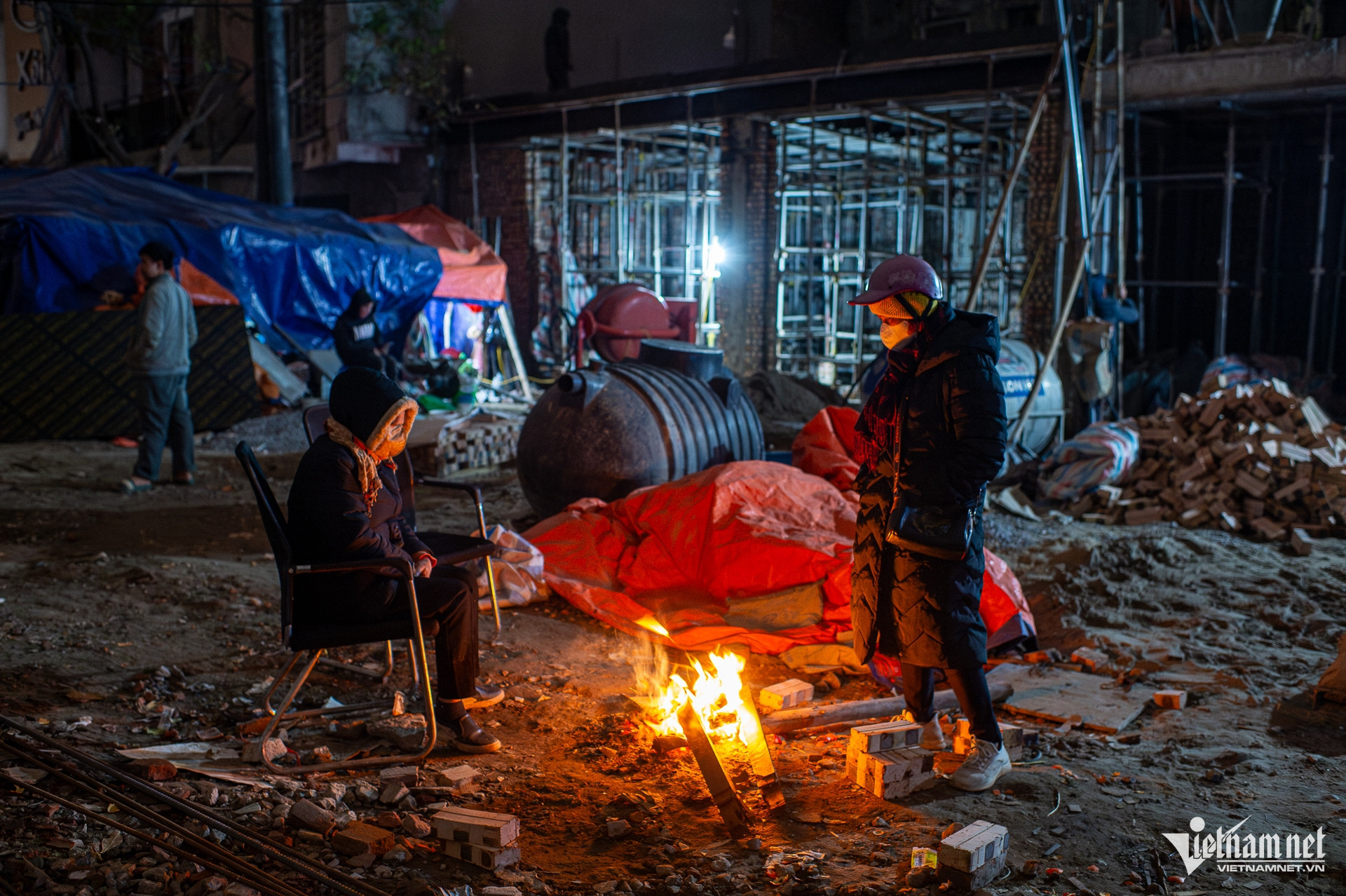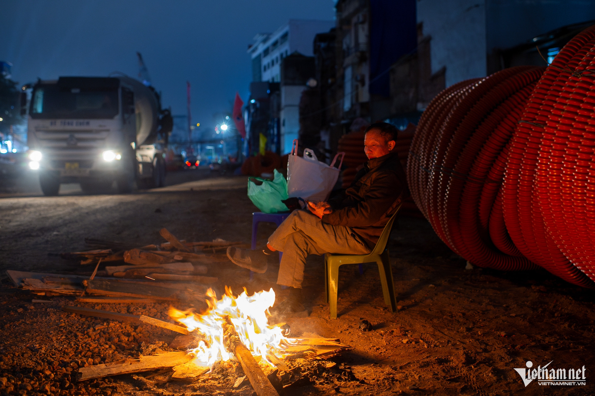 Tại khu vực công trường thi công tuyến đường Vành đai 1, một số người cũng tìm cách chống chọi với giá rét lúc 22h.