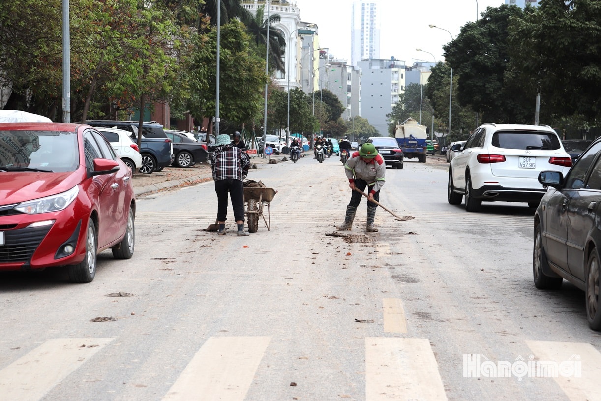 Bùn đất rơi vãi trên các tuyến đường xung quanh khu vực Dự án Khu công viên văn hóa – vui chơi, giải trí, thể thao Hà Đông (thuộc phường Kiến Hưng) vào sáng 16-3, gây trơn trượt, ảnh hưởng đến môi trường và an toàn giao thông. Ảnh: Tuấn Điệp