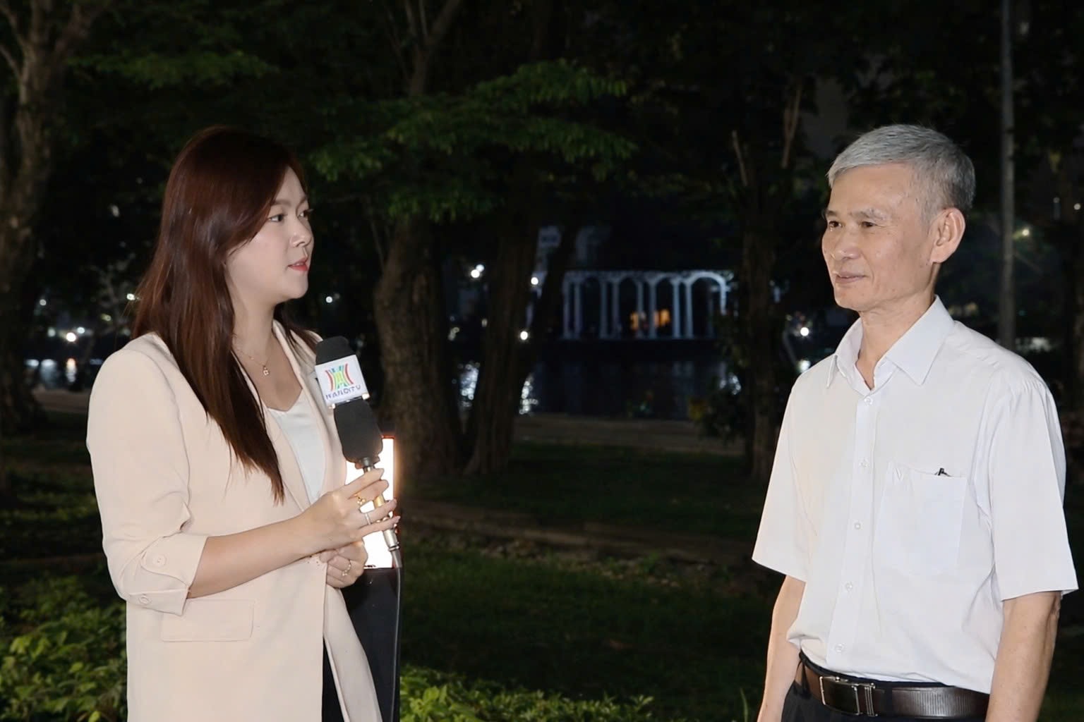 Ông Lê Văn Hữu (cư dân phường Hai Bà Trưng) trao đổi cùng phóng viên Cơ quan Báo và Phát thanh,Truyền hình Hà Nội tại Công viên Thống Nhất.