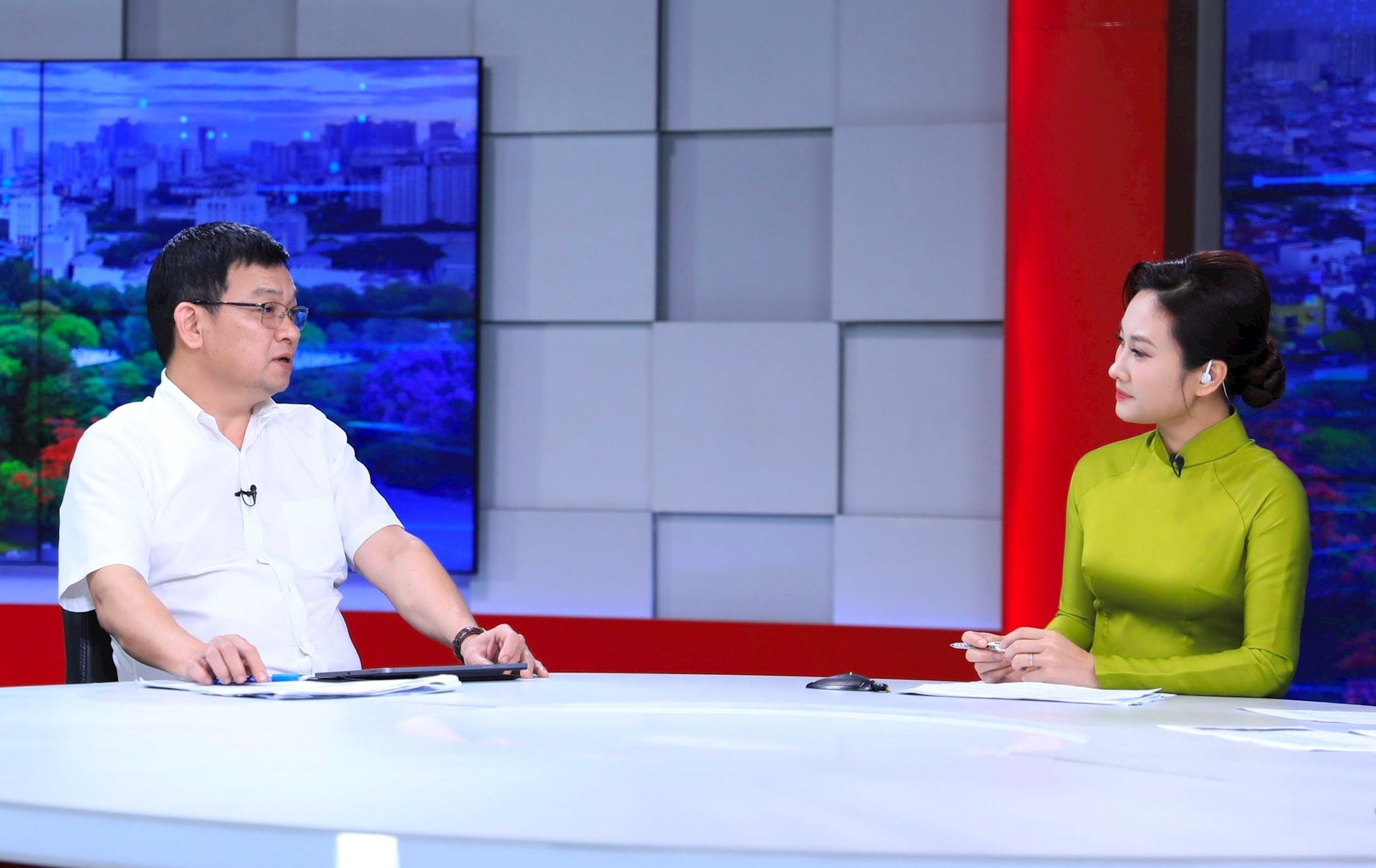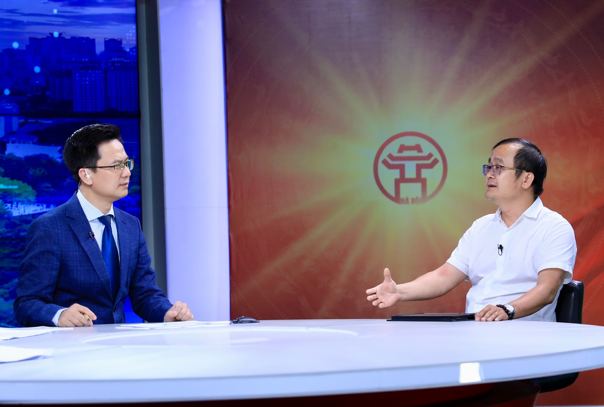 Ông Nguyễn Mạnh Hùng, Trưởng phòng Quản lý không gian ngầm và Cây xanh, chiếu sáng - Sở Xây dựng Hà Nội trao đổi tại trường quay. Ảnh: Quang Thái