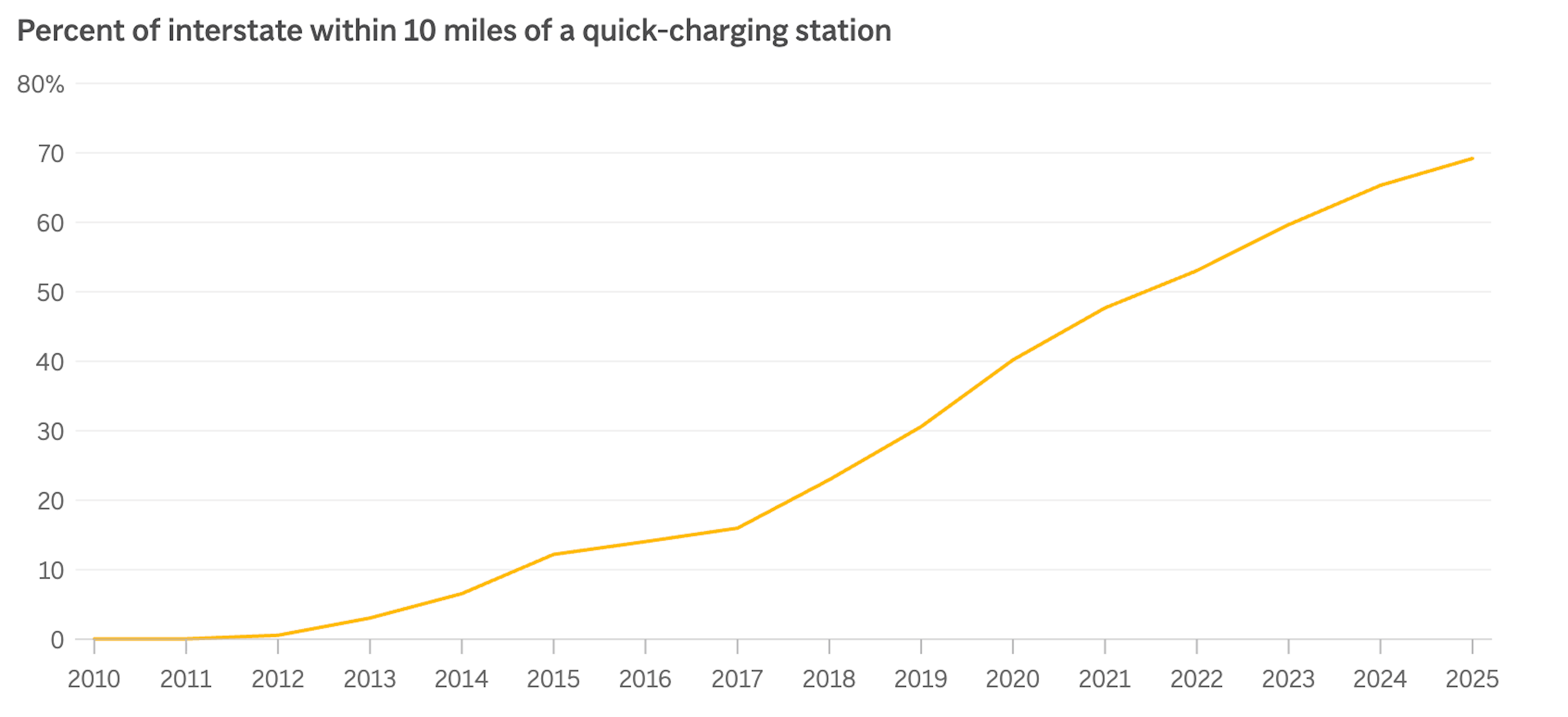 Tốc độ phát triển trạm sạc trong bán kính 16 km quanh các cao tốc ở Mỹ. (Ảnh: Phòng thí nghiệm Năng lượng Tái tạo Quốc gia. Đồ họa: M.K. Wildeman)