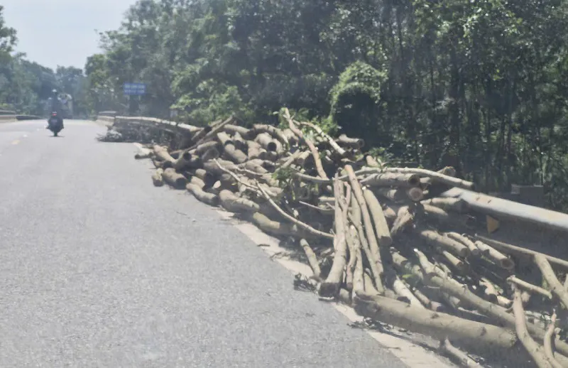 Sau mưa bão, dọc đường Hồ Chí Minh, Quốc lộ 15 và nhiều tuyến đường trên địa bàn tỉnh Hà Tĩnh gỗ keo tràm bị gãy đổ được người dân tận thu và sử dụng mặt đường để tập kết đx̌ưa đi tiêu thụ.