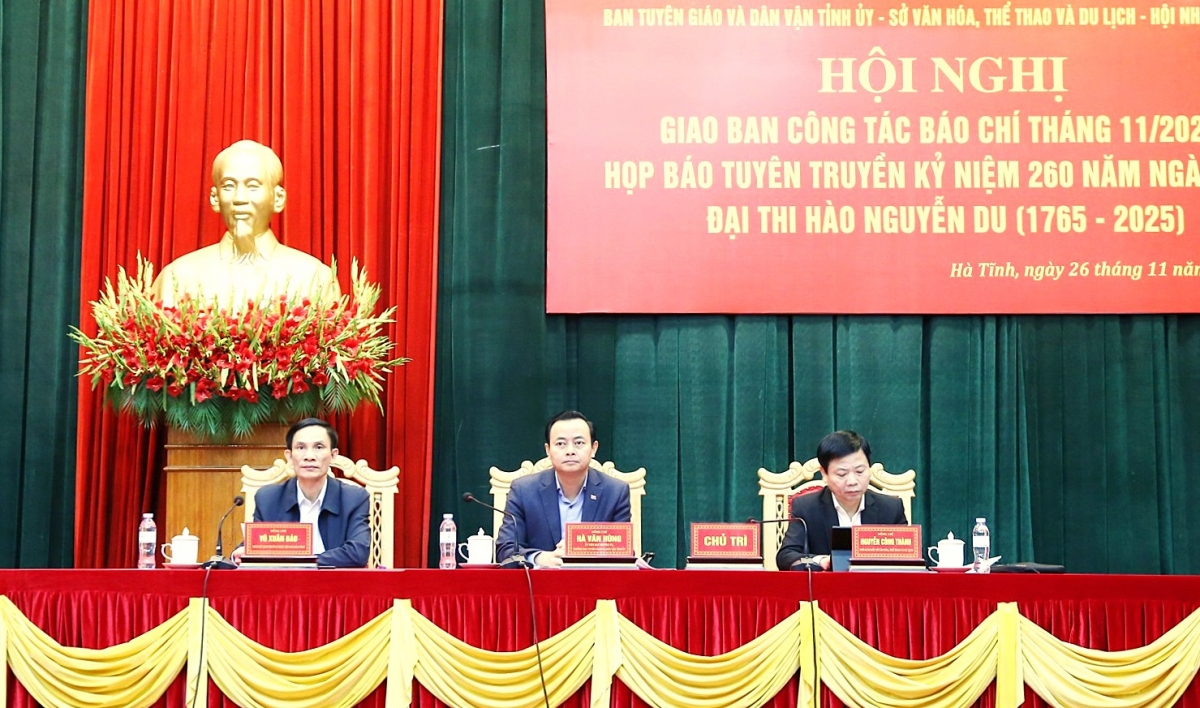 Sáng 26/11, Ban Tuyên giáo và Dân vận Tỉnh ủy Hà Tĩnh phối hợp với các đơn vị có liên quan tổ chức hội nghị giao ban công tác báo chí tháng 11/2025 và họp báo tuyên truyền kỷ niệm 260 năm Ngày sinh Đại thi hào Nguyễn Du (1765 - 2025).