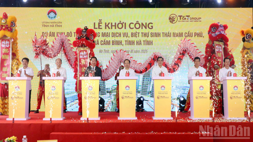 Đại diện lãnh đạo tỉnh Hà Tĩnh và Tập đoàn T&T thực hiện nghi thức khởi công dự án.