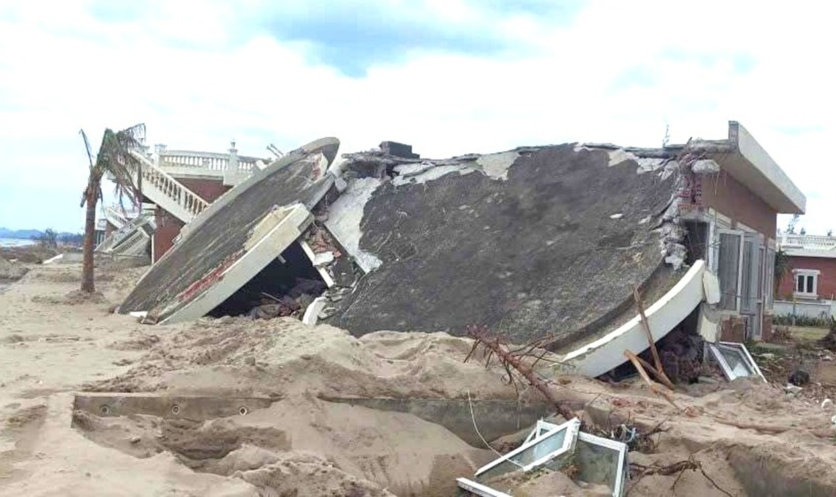 Nhiều căn biệt thự của Khu resort Hoa Tiên Xuân Thành bị sóng biển đánh sập trong bão số 10 Bualoi