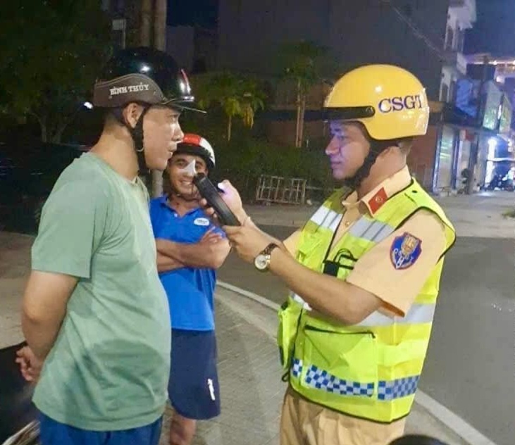 Cảnh sát giao thông kiểm tra nồng độ cồn của người tham gia giao thông.