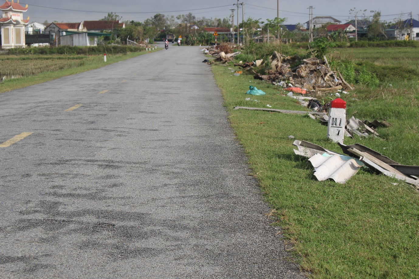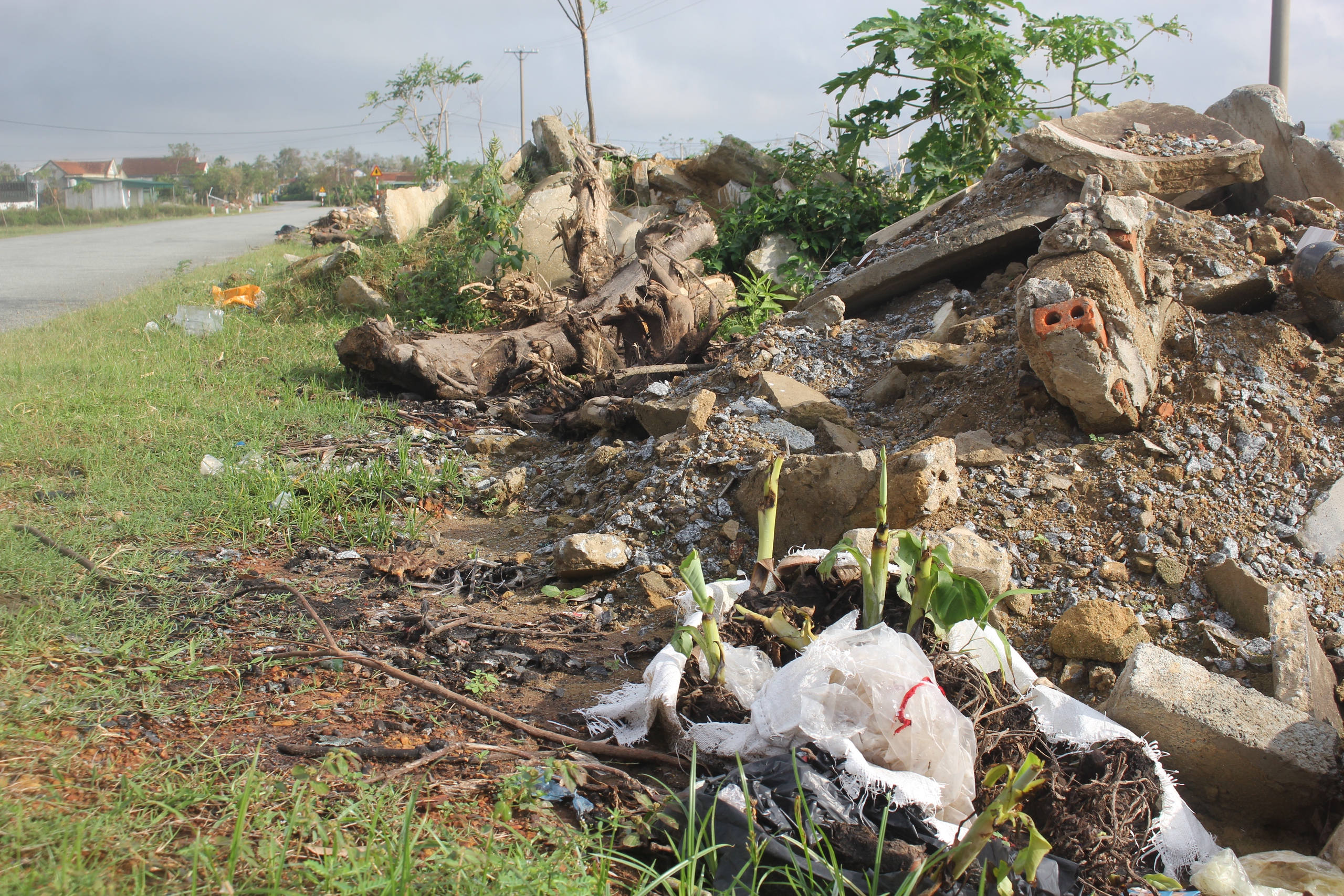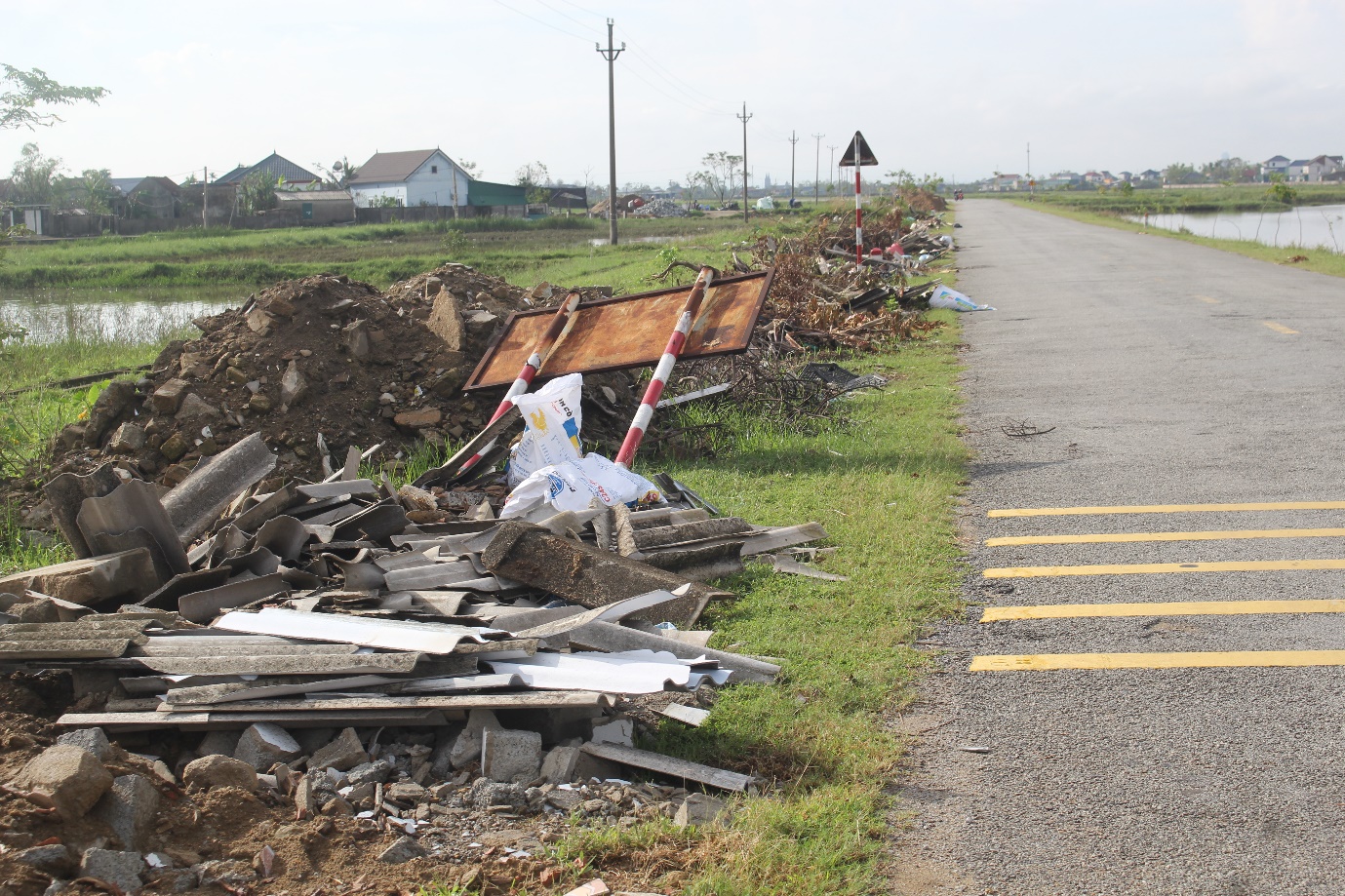 Sau cơn bão Bualoi, hàng trăm nhà dân và các công trình phụ trợ, cây cối ở các xã Mai Phụ, Lộc Hà bị hư hỏng nặng, gãy đổ... người dân nên có thể nhận thấy, những gạch, ngói, bê tông được thản nhiên đổ đầy hai bên lề đường.