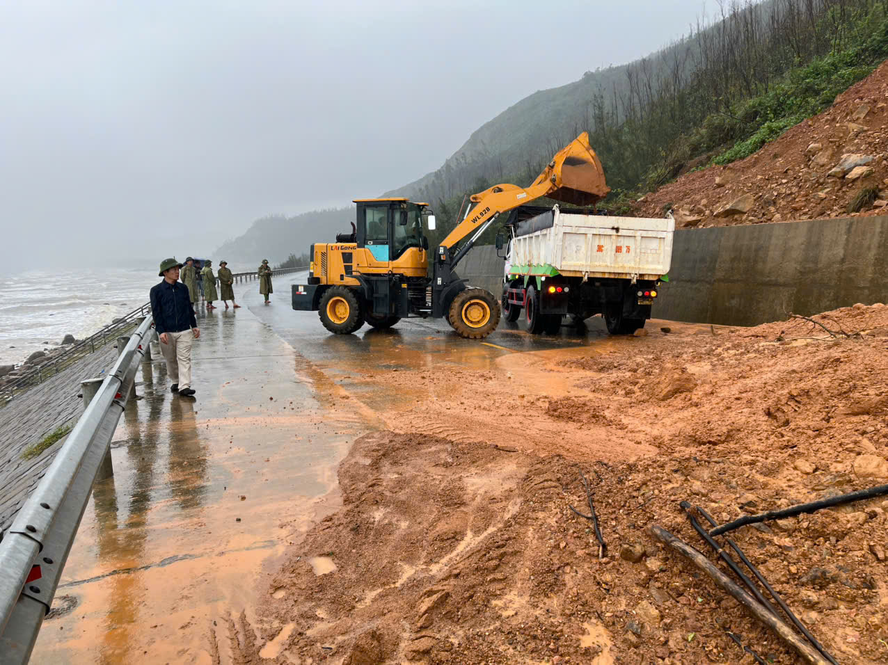 Lực lượng chức năng huy động phương tiện đào xúc đất đá sạt lở trên đường ven biển nối xã Kỳ Khang và phường Hải Ninh
