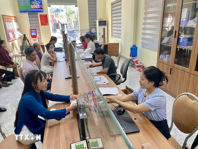 Người dân giao dịch tại Trung tâm phục vụ hành chính công xã Trường Lưu. (Ảnh: Hữu Quyết/TTXVN)