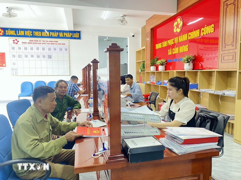 Người dân giải quyết thủ tục về đất đai tại Trung tâm phục vụ hành chính công xã Cẩm Hưng. (Ảnh: Hữu Quyết/TTXVN)