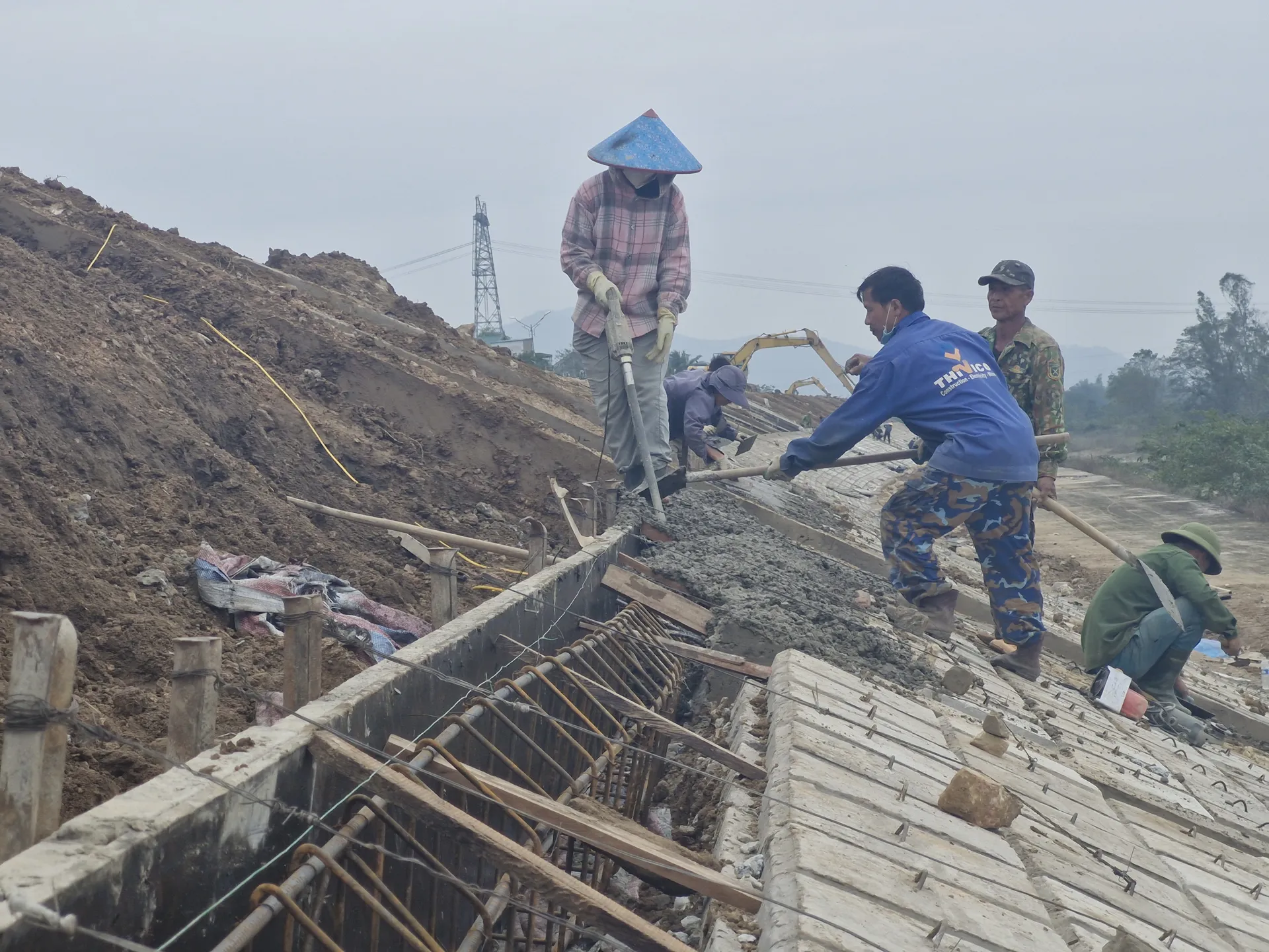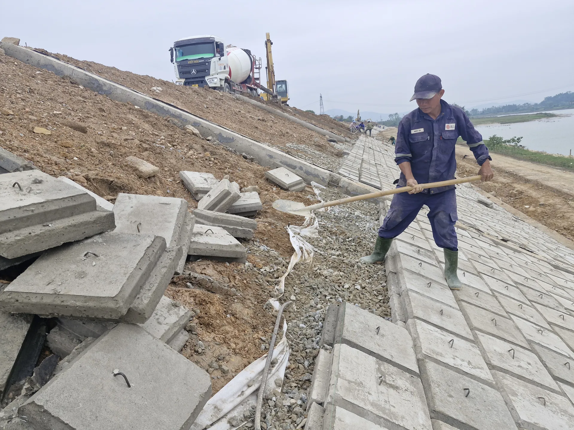 Quá trình triển khai thực hiện dự án, điều kiện thời tiết không thuận lợi, mưa lũ kéo dài, việc thi công bị gián đoạn. Sau khi thời tiết ổn định, chủ đầu tư đã chỉ đạo nhà thầu tập trung huy động tối đa nhân công, máy móc xây dựng khung dầm chịu lực, lắp ghép cấu kiện bê tông mái đê và các hạng mục công trình.