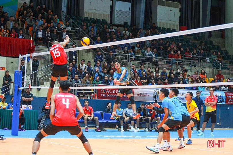 Đội bóng chuyền Hà Tĩnh (áo đỏ) có trận đấu ra quân Giải Bóng chuyền hạng A gặp Bộ Tư lệnh Cảnh sát cơ động.