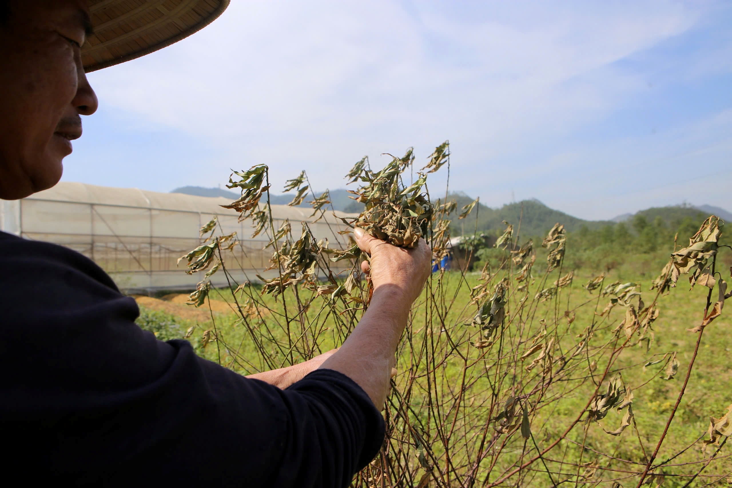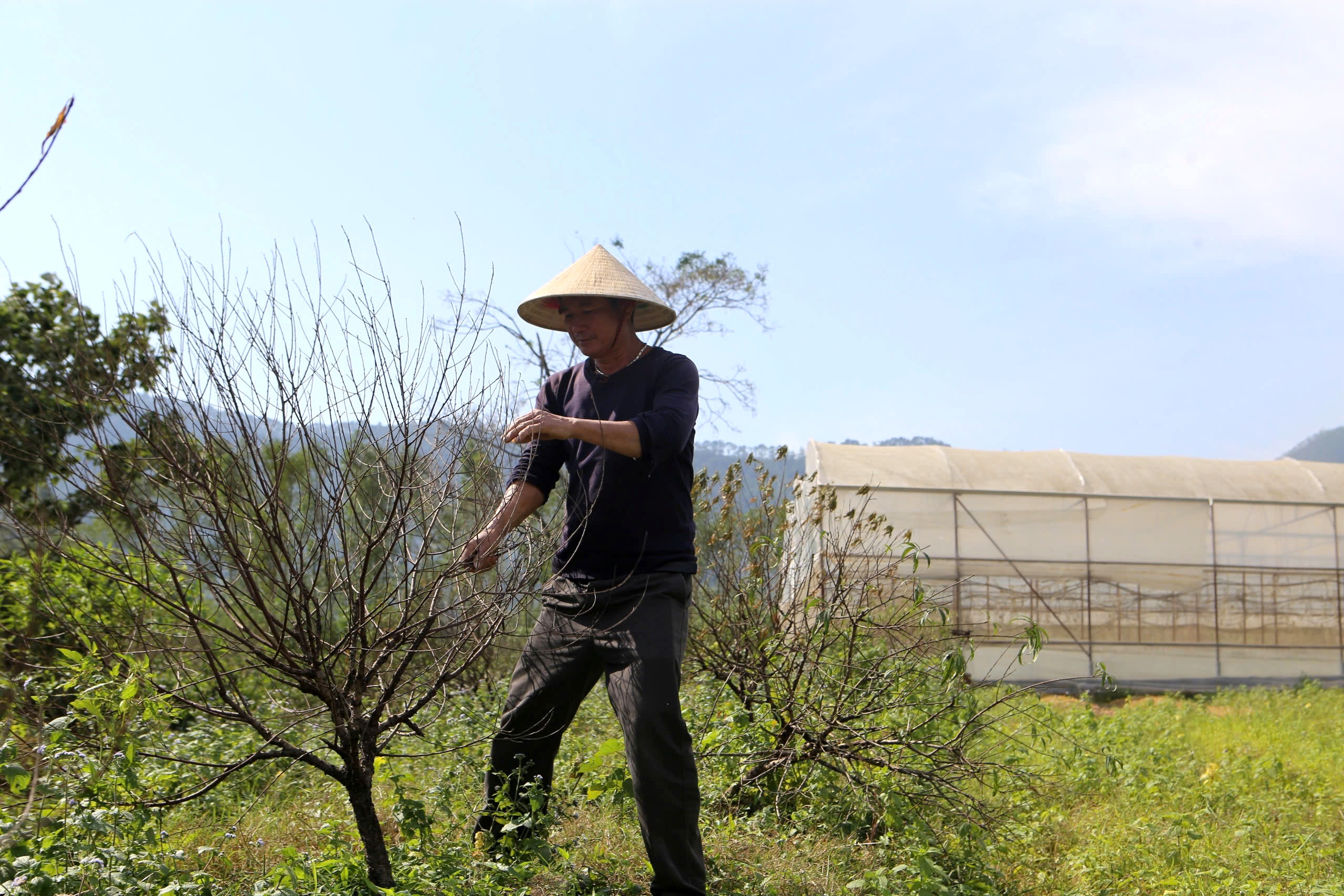 Ông Trần Hựu (trú xã Toàn Lưu) lo lắng bên những cây đào phai đã héo úa, chết dần do bão, mưa lũ