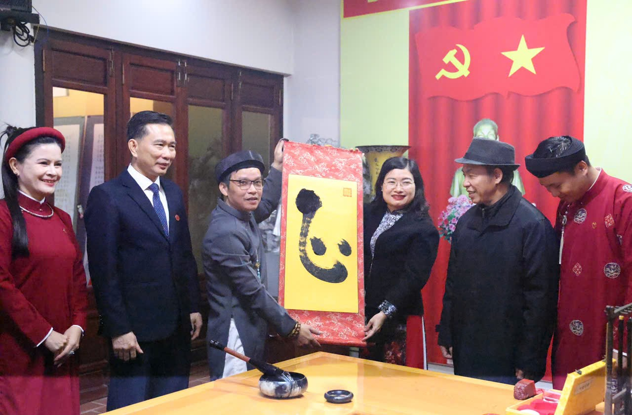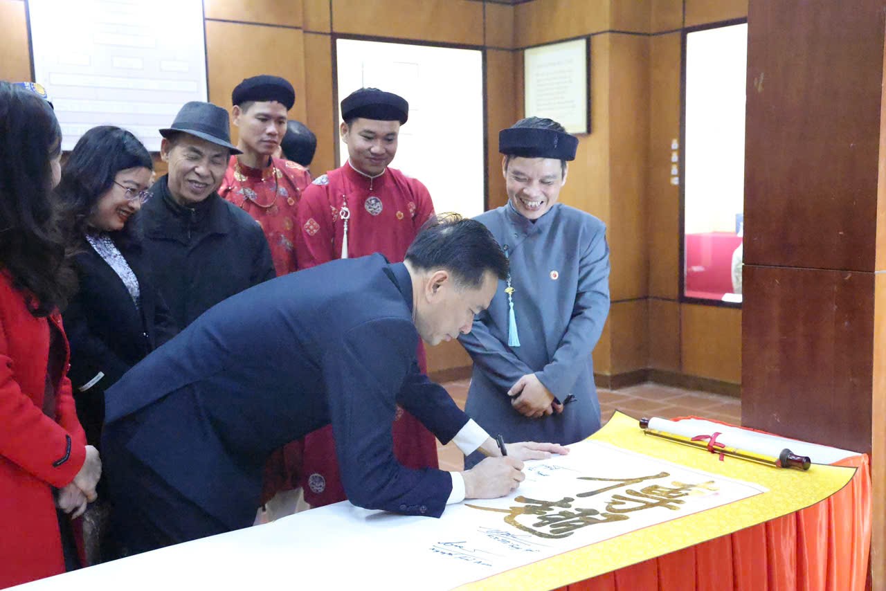 Tặng chữ thư pháp tại không gian trưng bày.