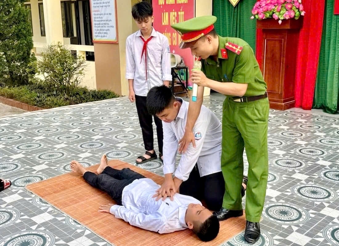 Công an xã Vũ Quang hướng dẫn học sinh thực hành các kỹ năng về cứu hộ cứu nạn cơ bản
