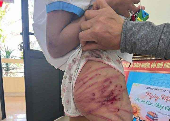 Trước đó, mạng xã hội lan truyền hình ảnh một bé gái mặc đồng phục, phần đầu, lưng và mông có nhiều vết bầm tím, trầy xước.
