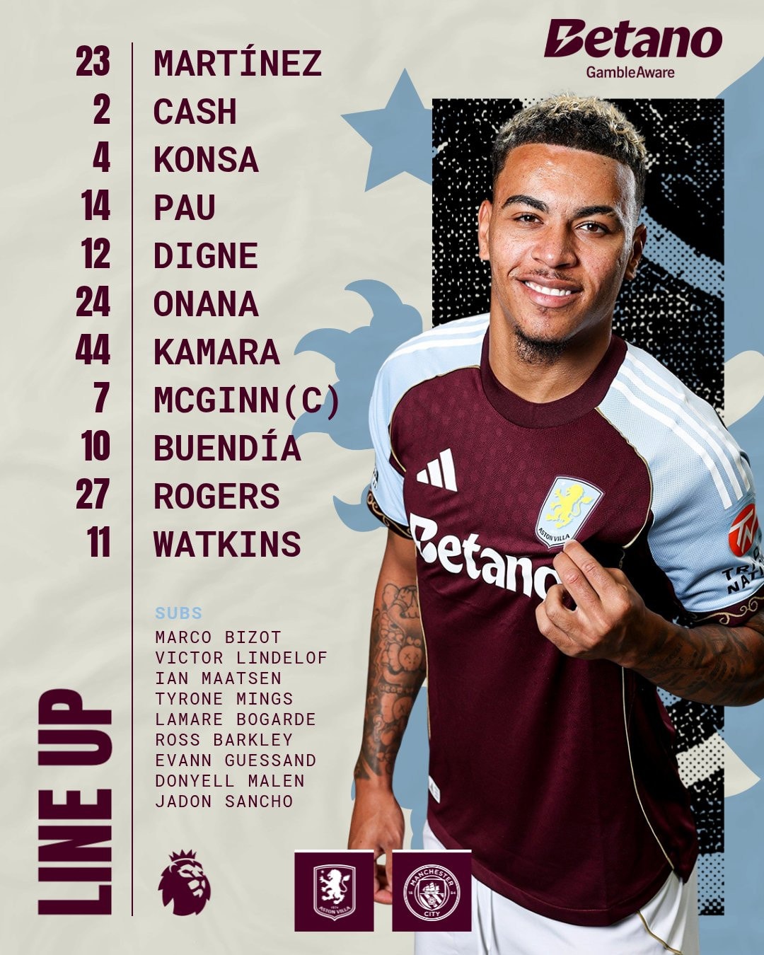 Martinez; Cash, Konsa, Pau Torres, Digne; Onana, Kamara; Buendia, Rogers, McGinn; Watkins.