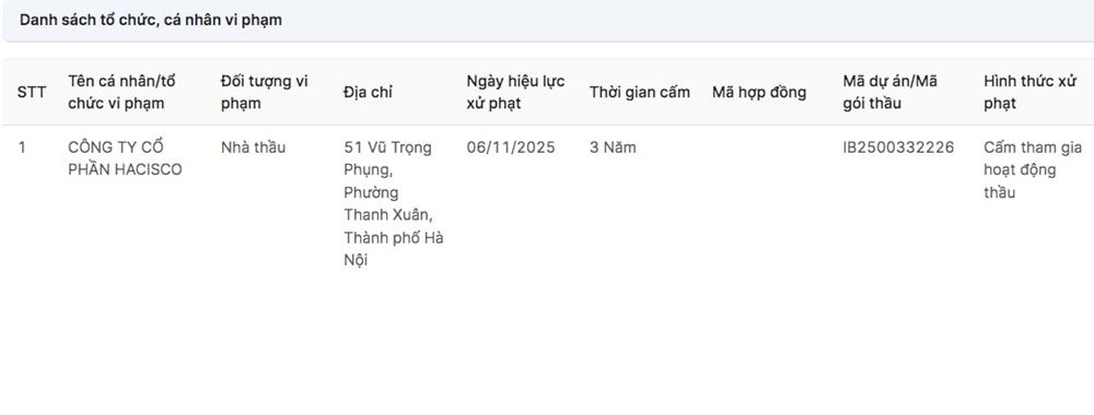 Quyết định được đưa ra trên cơ sở xác định Hacisco đã vi phạm quy định về hành vi bị cấm trong đấu thầu, theo khoản 4 Điều 16 Luật Đấu thầu 2023, khi tham dự Gói thầu SC3-HLD-2025 Thi công sửa chữa hệ thống điện tuyến cao tốc TP.HCM - Long Thành - Dầu Giây.