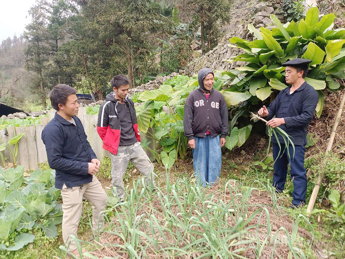 Đồng chí Thò Mý Xá, Bí thư Chi bộ thôn Cán Chu Phìn, Đảng bộ xã Khâu Vai hướng dẫn Nhân dân kỹ thuật trồng tỏi.