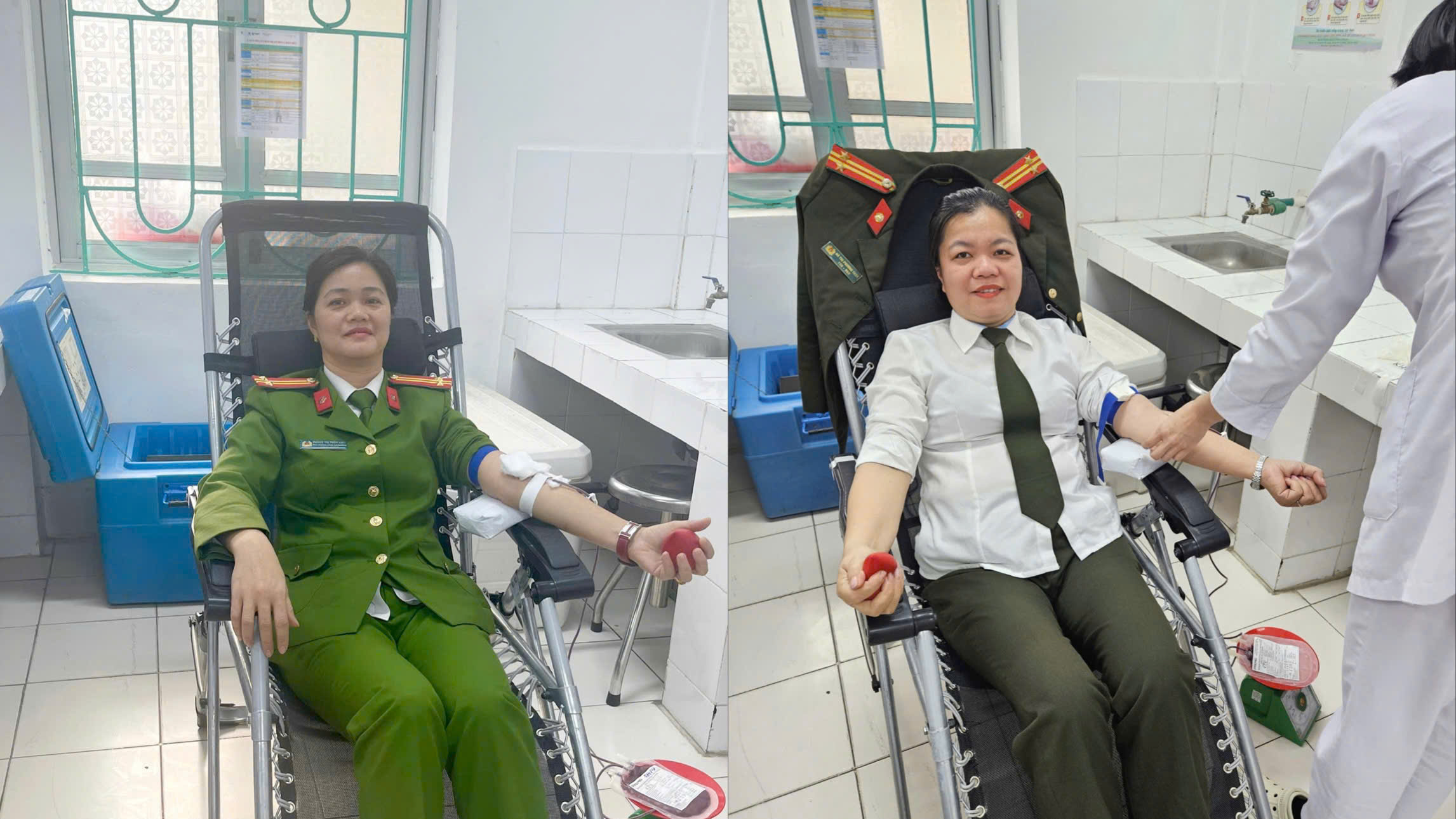 Đồng chí Phùng Thị Thùy Linh, Phó Trưởng Công an phường và đồng chí Hà Thị Phương Thùy, Tổ trưởng Tổ Tổng hợp Công an phường Nùng Trí Cao kịp thời hiến máu cứu người.