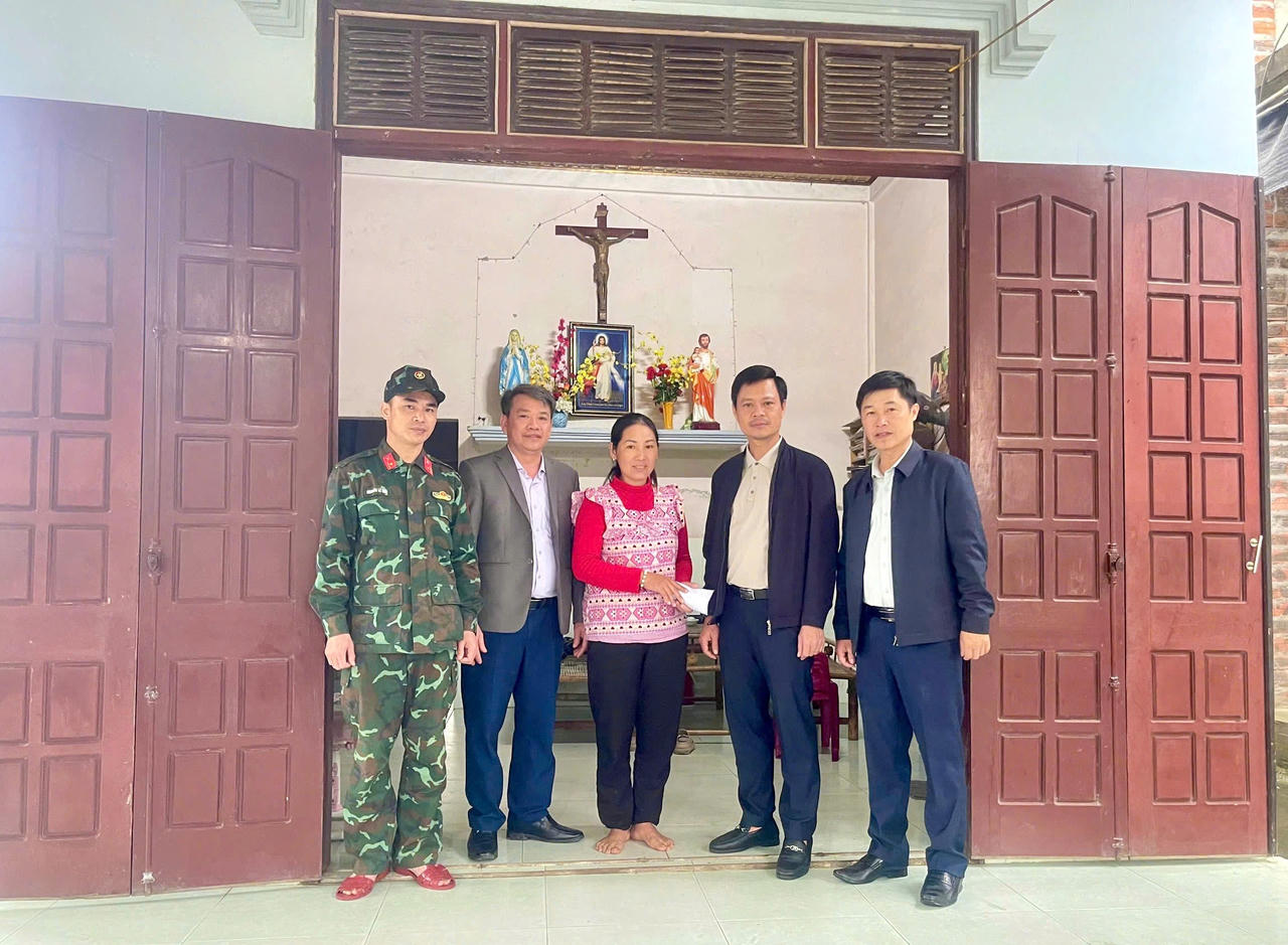 Đại diện chính quyền xã Tân Gianh và lực lượng chức năng thăm hỏi, động viên, trao quà cho gia đình ông Cao Hữu Tình sau hành động dũng cảm cứu người trên sông Gianh.