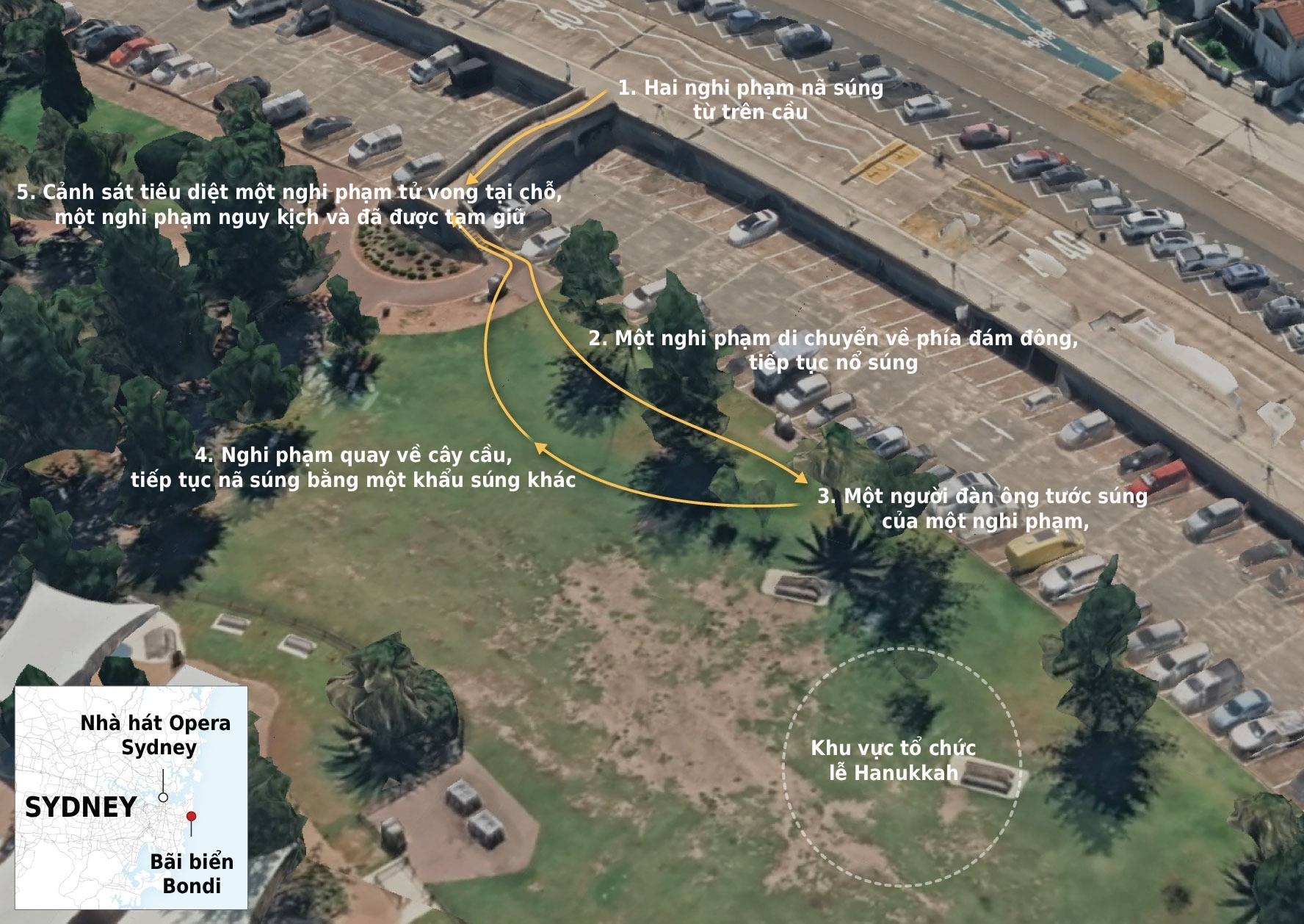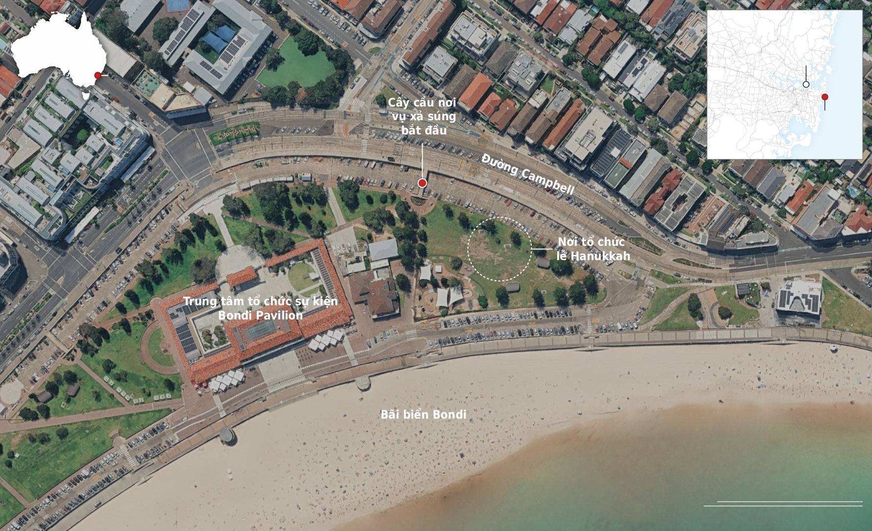 Hai tay súng đứng trên một cây cầu dành cho người đi bộ, nằm sát đường Campbell Parade, nổ súng về phía khu vực đang diễn ra lễ Hanukkah. Sau đó, một tay súng rời cây cầu, đi về phía bãi cỏ nơi đám đông đang tụ tập.
