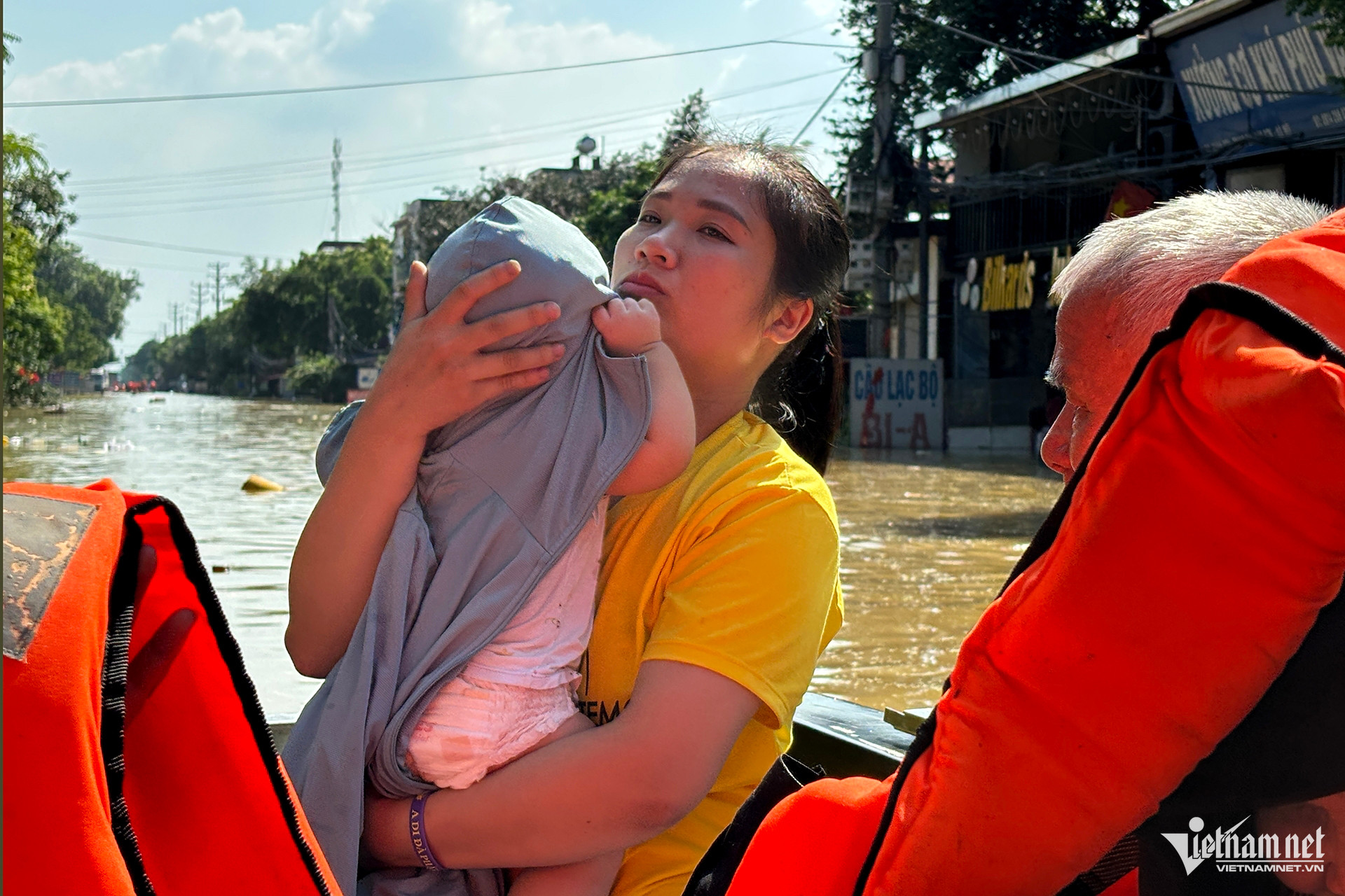 Chị Xuân bế con 8 tháng tuổi vượt lũ...