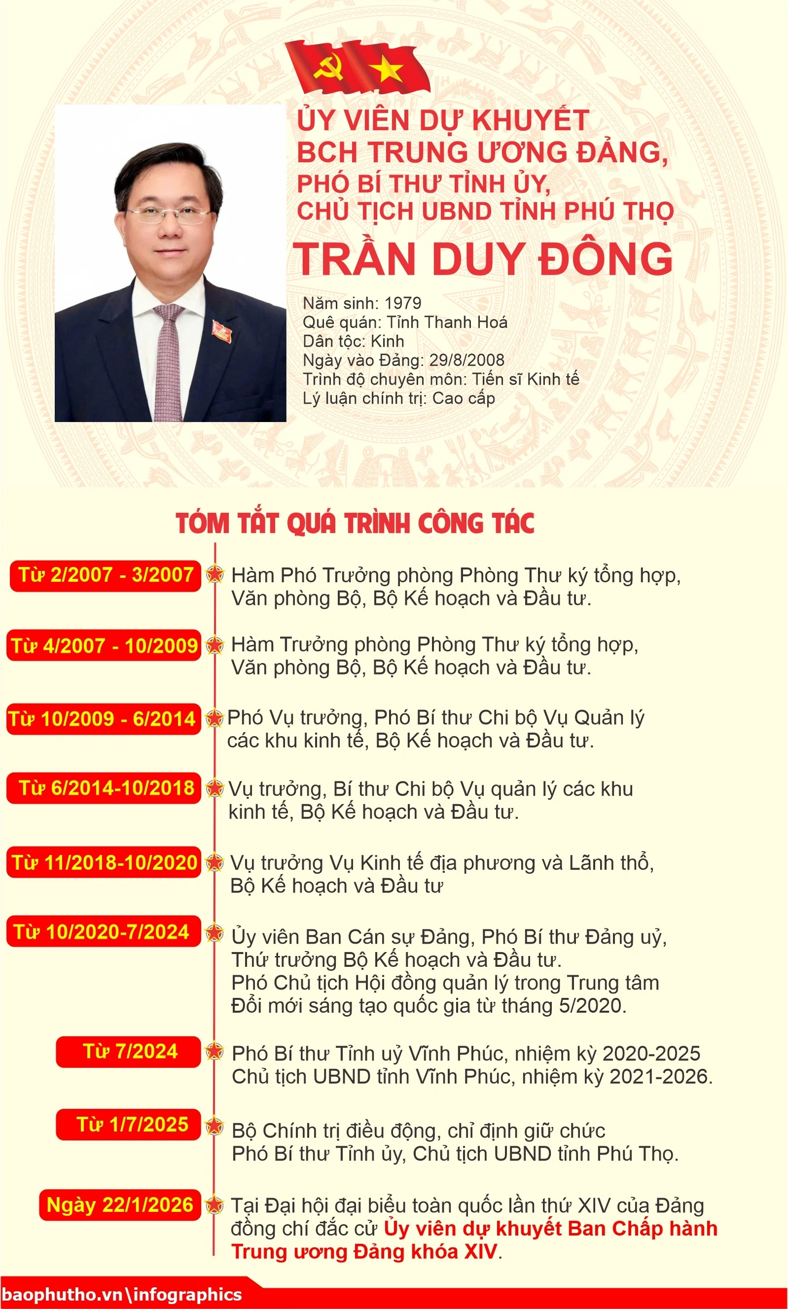 Đoàn đại biểu Đảng bộ tỉnh Phú Thọ vinh dự có 2 đồng chí được bầu vào Ban Chấp hành Trung ương Đảng khóa XIV. Trong đó: Đồng chí Phạm Đại Dương - Ủy viên Ban Chấp hành Trung ương Đảng khóa XIII, Bí thư Tỉnh ủy tái đắc cử vào Ban Chấp hành Trung ương Đảng khóa XIV. Đồng chí Trần Duy Đông - Phó Bí thư Tỉnh ủy, Chủ tịch UBND tỉnh được bầu là Ủy viên dự khuyết Ban Chấp hành Trung ương Đảng khóa XIV.