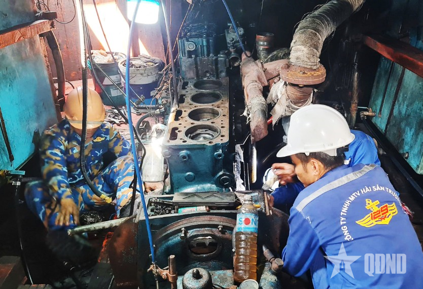 Thợ kỹ thuật Hải đoàn 129 sửa chữa sự cố tàu cá ngư dân.