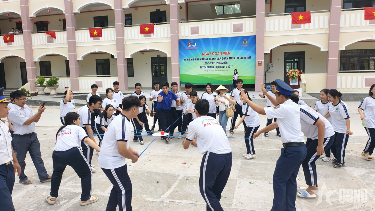 Cán bộ, đoàn viên Hải đội 401 tham gia các trò chơi vận động cùng các em học sinh.