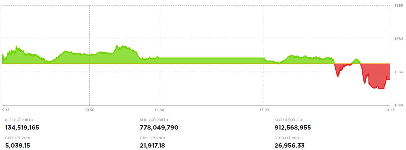 Đóng cửa, sàn HOSE có 75 mã tăng và 248 mã giảm, VN-Index giảm 7,62 điểm (-0,46%), xuống 1.660,36 điểm. Tổng khối lượng giao dịch đạt hơn 912,5 triệu đơn vị, giá trị 26.956,3 tỷ đồng, tăng gần 60% về khối lượng và 55% về giá trị so với phiên hôm qua. Giao dịch thỏa thuận đóng góp hơn 134,6 triệu đơn vị, giá trị 5.041 tỷ đồng.