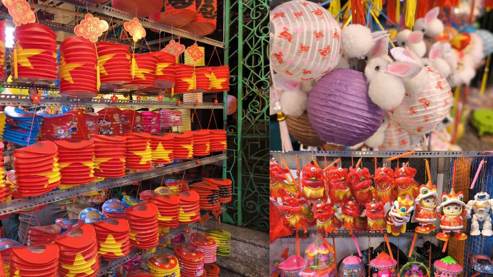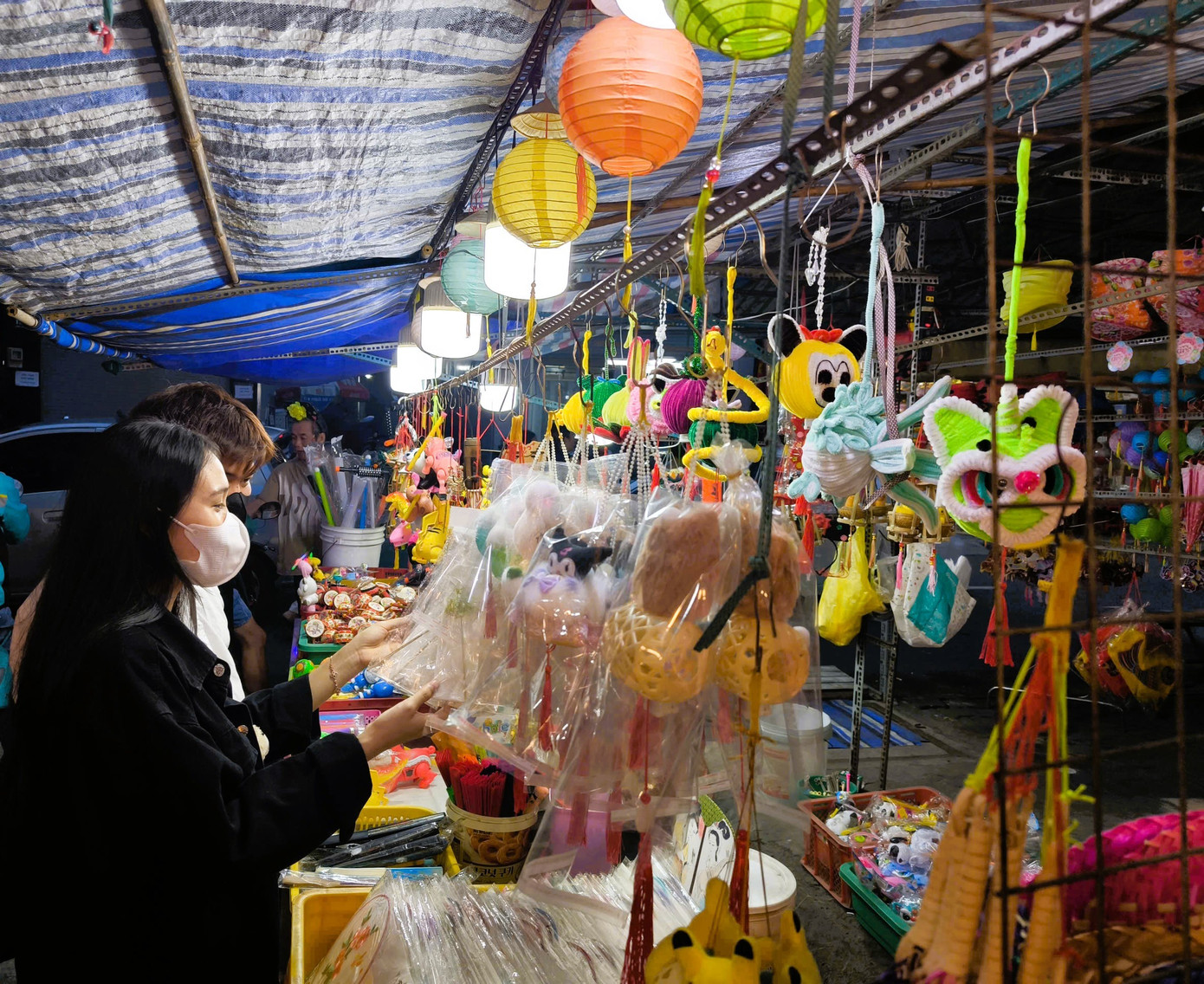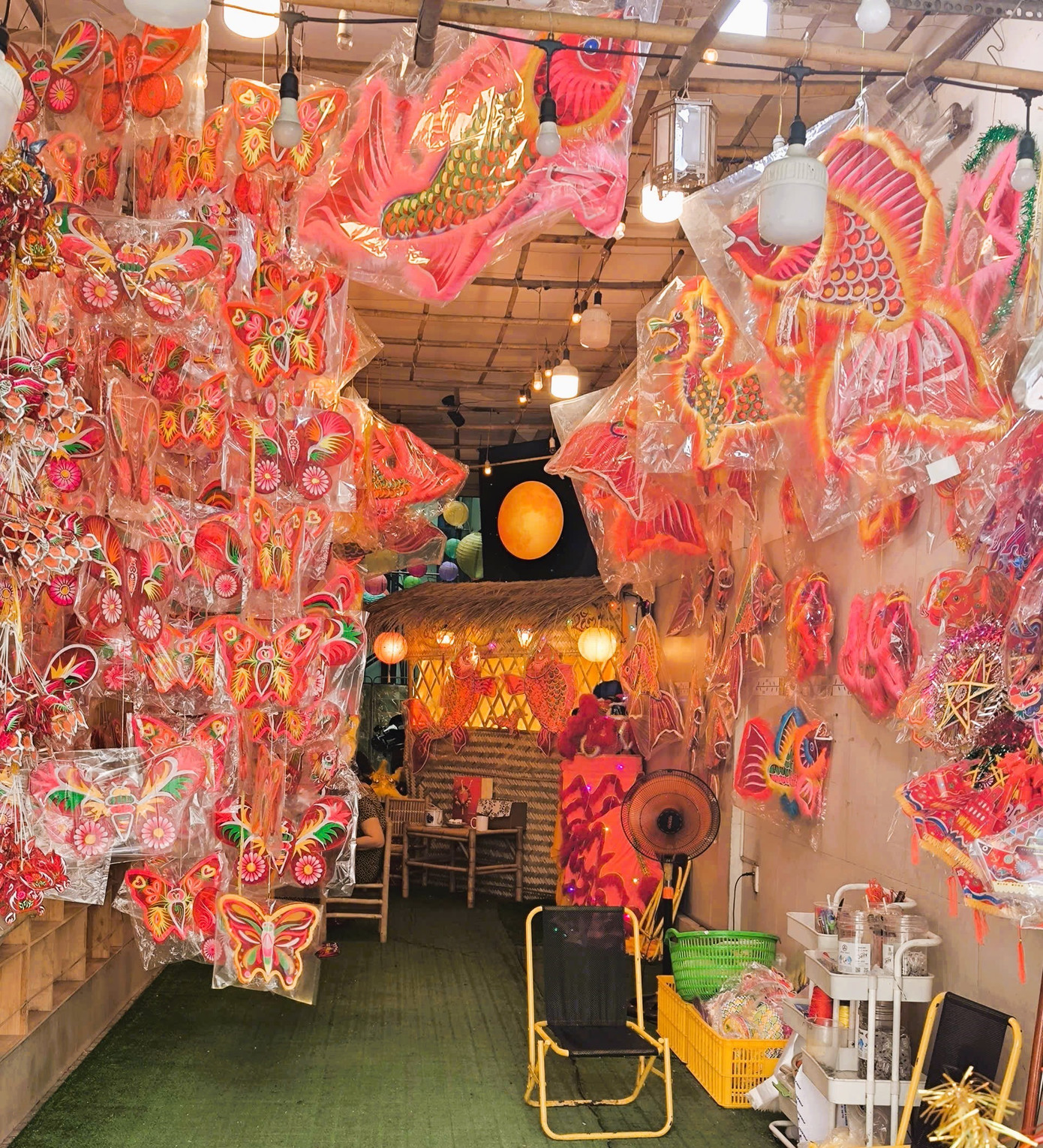 Dạo quanh một vòng con phố này, lồng đèn truyền thống vẫn được trưng bày nhiều nhất với đủ loai hình dáng bắt mắt, từ hình ông sao, cá chép đến thỏ ngọc, bươm bướm, gà trống…