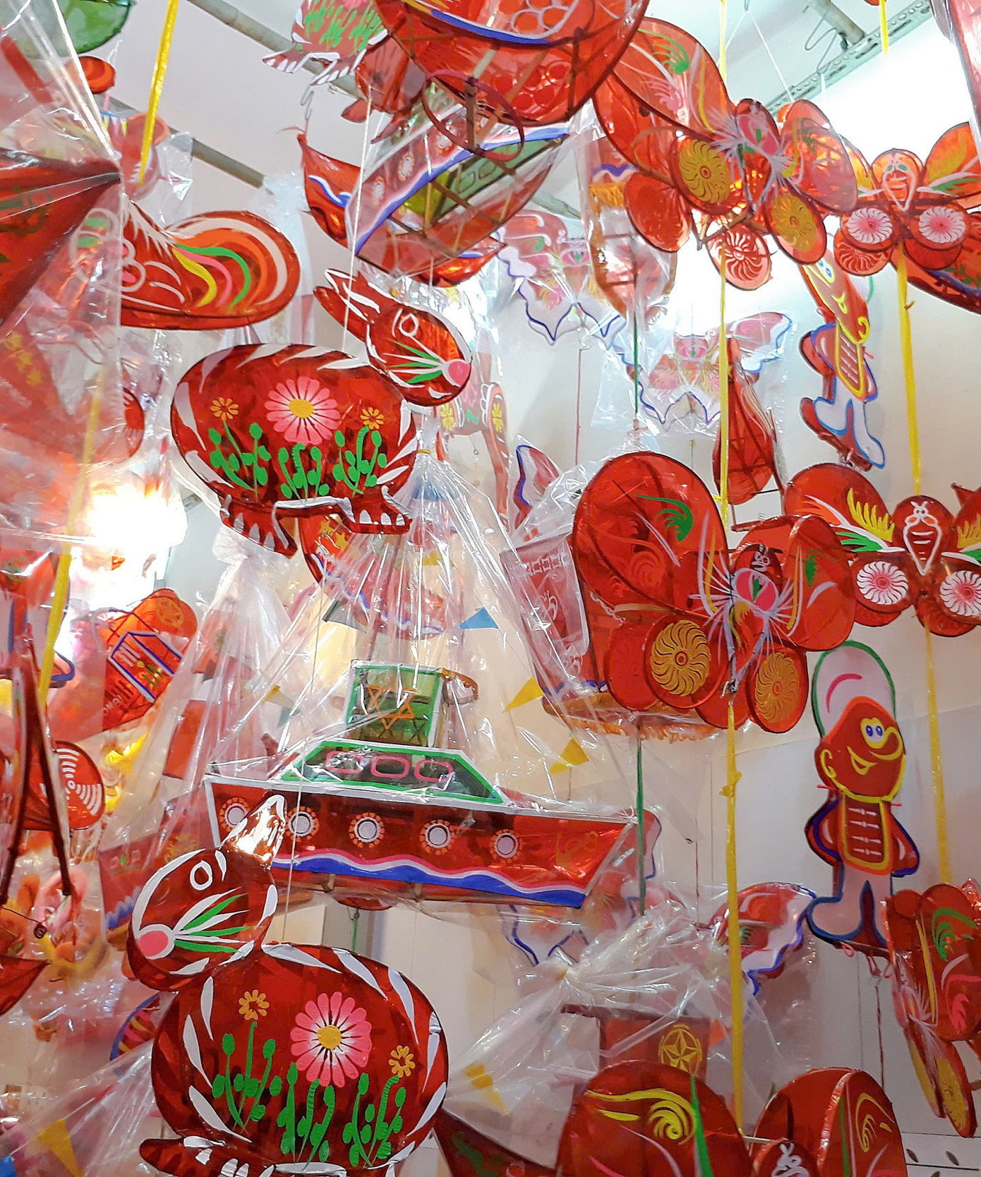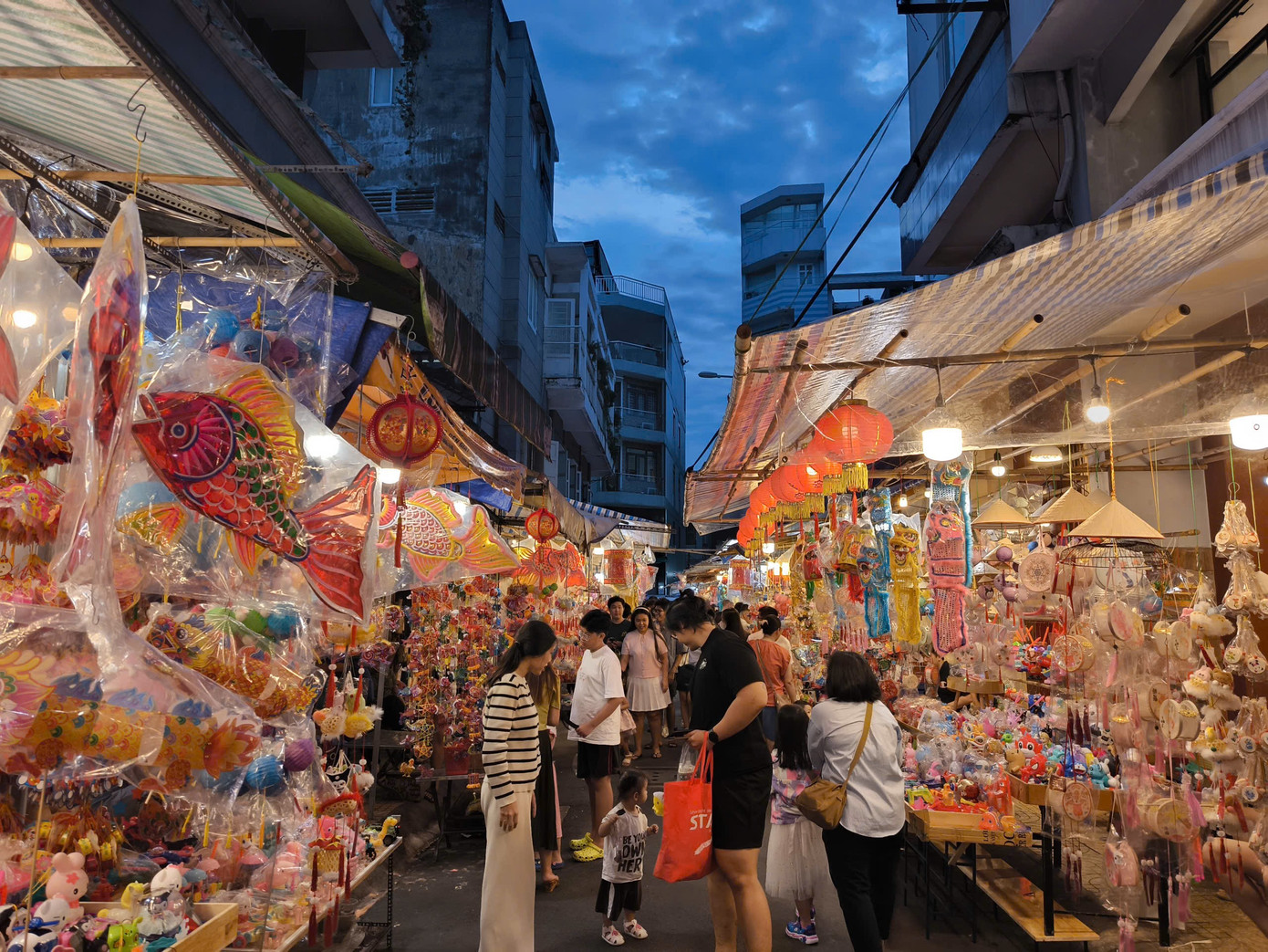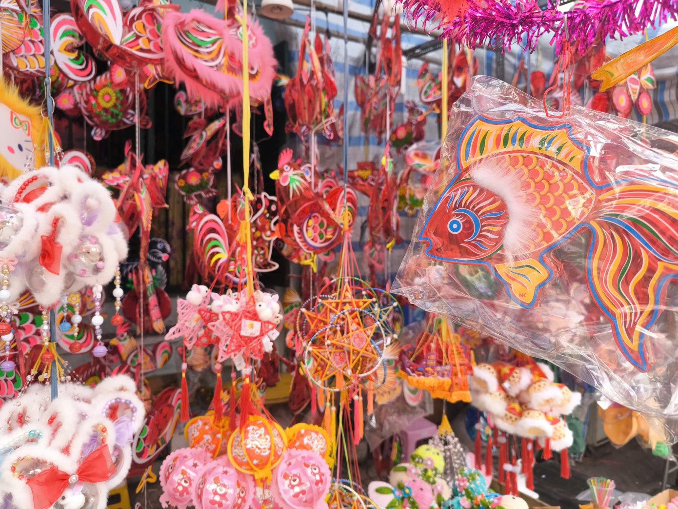 Dạo quanh một vòng con phố này, lồng đèn truyền thống vẫn được trưng bày nhiều nhất với đủ loai hình dáng bắt mắt, từ hình ông sao, cá chép đến thỏ ngọc, bươm bướm, gà trống…