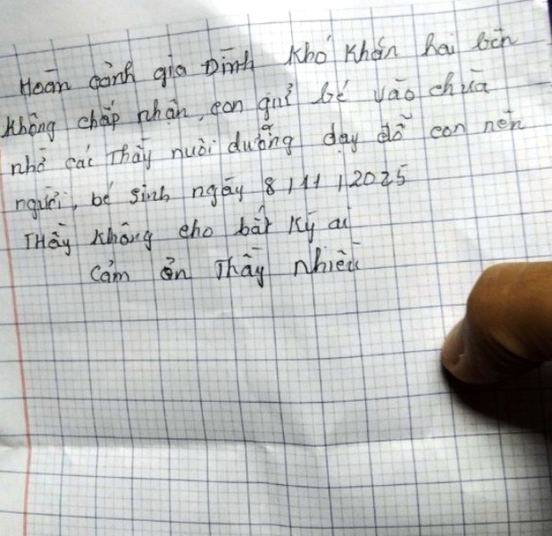 Bức thư để lại nhờ nuôi dưỡng bé, trình bày về hoàn cảnh gia đình với nội dung: “Hoàn cảnh gia đình khó khăn, hai bên gia đình không chấp nhận, con gửi bé vào chùa nhờ các thầy nuôi dưỡng, dạy dỗ con nên người. Bé sinh ngày 8/11/2025. Thầy không cho bất kỳ ai. Cảm ơn thầy nhiều”. Nội dung bức thư khiến nhiều người đọc được không khỏi xót xa.