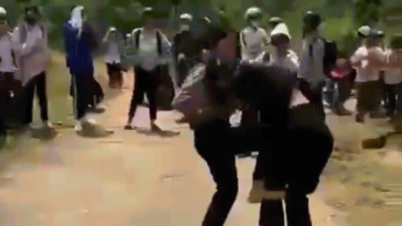 Hai học sinh đánh nhau, xung quanh nhóm bạn reo hò, cổ vũ phản cảm.