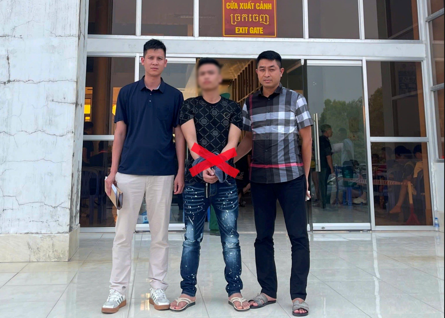 Đội Cảnh sát hình sự đặc nhiệm bắt giữ đối tượng Lê Văn Thủy (x) tại cửa khẩu Dinh Bà, tỉnh Đồng Tháp. (Ảnh: CAHP).