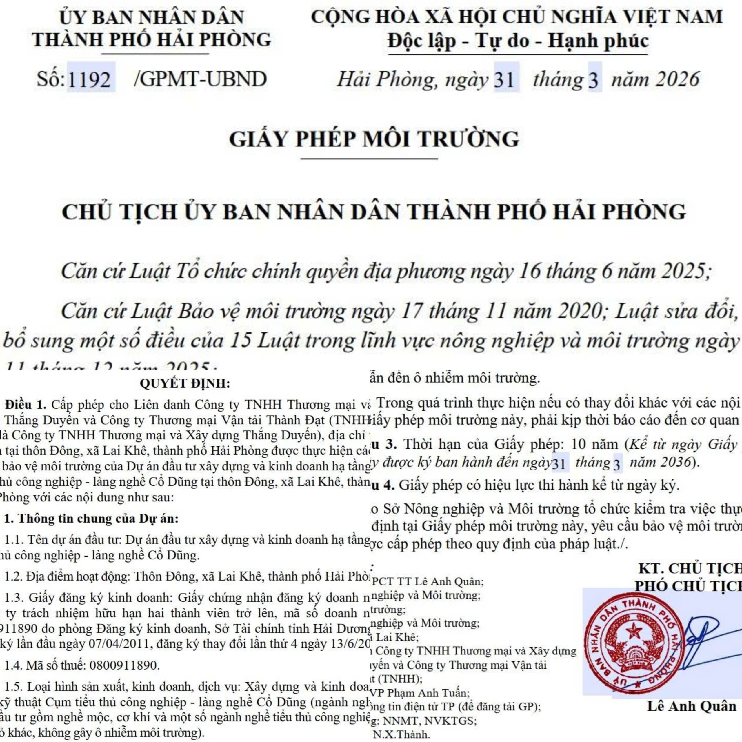 Giấy phép môi trường số 1192/GPMT-UBND do ông Lê Anh Quân, Phó Chủ tịch UBND TP Hải Phòng ký ngày 31/3/2026 cấp phép cho Liên danh Công ty TNHH Thương mại và Xây dựng Thắng Duyến và Công ty Thương mại Vận tải Thành Đạt (đại diện là Công ty TNHH Thương mại và Xây dựng Thắng Duyến), địa chỉ trụ sở chính tại thôn Đông, xã Lai Khê, TP Hải Phòng được thực hiện các hoạt động bảo vệ môi trường của Dự án đầu tư xây dựng và kinh doanh hạ tầng Cụm tiểu thủ công nghiệp - làng nghề Cổ Dũng tại thôn Đông, xã Lai Khê, TP Hải Phòng.